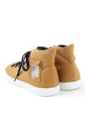 劇中の調査兵団をモチーフに、彼らのジャケットと同様ベージュを基調にデザインされたこのシューズ。側面には調査兵団を象徴する「自由の翼」の紋章をプリントしたポケットがあしらわれている。シューズの裏地には、団員が壁外調査時に羽織る緑のマントをイメージしたカラーリングが採用された。