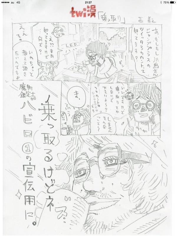 少年ジャンプNEXT!!(集英社)にて連載中の自作、「魔物鑑定士バビロ」1巻発売の宣伝と称して行われる「twi漫」。本日の投稿分では、西が担当編集者からTwitterのアカウント情報を聞き出し、乗っ取りを企てる様子がコミカルに描かれている。このほか