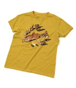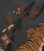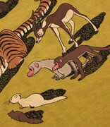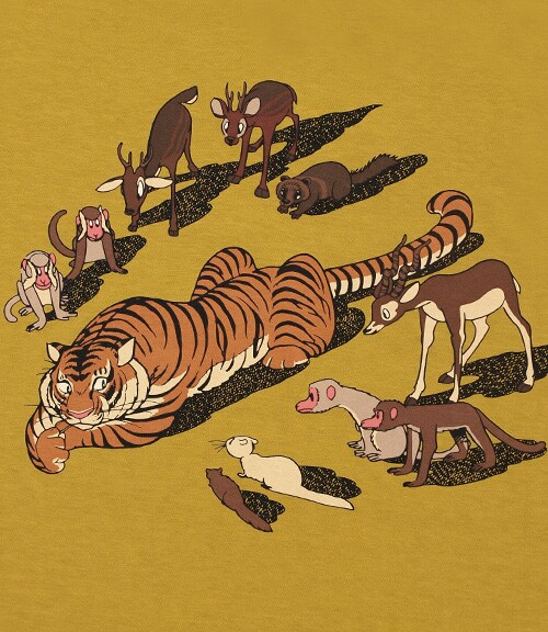 「タッタと虎」には、動物と心を交わせることのできたタッタが虎に乗り移った姿と、彼を囲む動物たちが描かれた。カラーはイエロー、ナッツ、ブラックの3種類。一方「煩悩」は、作中で少年が仙人のひょうたんをのぞくと見えた、煩悩の火を背面にプリントしている。こちらのカラーはホワイト、サックス、ブラックの3種類。