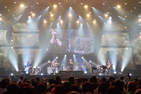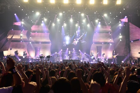 昨日25日に行われた公演同様、会場には全国各地から4000人のファンが集結。またニコニコ生放送で生配信や、東京・ニコファーレでライブビューイングも行われ、多くのファンがGLAYが故郷に錦を飾る様子を見届けた。開演時刻を迎えると、ステージ中央のスクリーンに2年前の「GLORIOUS MILLION DOLLAR NIGHT Vol.1」の映像が上映され観客の期待を高めていき、「GLAY IS BACK」の文字とともにガッツポーズをしながらメンバーが登場した。「OK、函館! 熱く行こうぜ!」というTERU(Vo)のシャウトとともに投下されたのは「My Private "Jealousy"」。ノイジーなロックチューンが、オーディエンスの興奮を煽っていく。Toshi Nagai(Dr)の叩くタイトなドラムから幕を開けた「天使のわけまえ」では、哀切を感じさせる音色がオーディエンスの耳を惹き付ける。哀愁が漂うムードは、続く「疾走れ!ミライ」で一変。清涼感のあるバンドサウンドと、TERUの伸びやかな歌声が場内にさわやかな空気を送り込んだ。