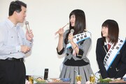 新潟名物を試食するコーナーでは、特産品の新潟枝豆を目にした泉田知事がメンバーの緊張をほぐすように「ビールはないのかな?」と冗談交じりにコメントすると、3人のこわばった表情にも笑顔がこぼれる。そして北原は十全茄子の漬物、西潟は越ノ光ポークソーセージ、荻野は笹団子を試食すると思わず満面の笑みに。笹団子の笹を剥くのに手間取る荻野に、泉田知事がそのコツを優しくレクチャーする場面も見られた。最後は泉田知事から3人へ「NGT48さんの歌やダンスを観るときに、その皆さんが新潟ふるさと名物商品のことも思い出してもらえるようになると大変うれしいです。がんばってください」と激励の言葉が送られた。