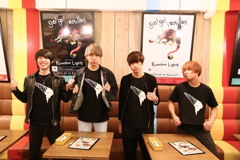 「バニカフェ」は2月10日にバニラズのニューアルバム「Kameleon Lights」が発売されることを記念して開店したもの。彼らのアーティスト写真と似た構図で撮影できるパネルなどが設置された店内では、バンドとのコラボメニューを味わうことができる。訪れたファンは興奮した様子でコラボメニューや店内のデコレーションを写真に収めていた。