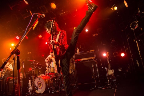 その後5人は、タイチ(Dr)の刻む軽やかなビートで始まる「終わりなき午後の冒険者」や、ロマンチック☆安田(Key)が華麗なダンスを披露する「唯一人」といった既発曲を演奏する一方で、安田がコール&レスポンスを巻き起こす「KEN・KYO・NI・ORA・TSUKE」、キョウスケが作曲したソウルフルな「DA DA DA」、メンバーの「この曲がすごく歌いたかったです」という言葉から始まった「EVe」など新曲も惜しみなく披露していく。MCではひさしぶりのライブということでメンバー紹介が行われ、「猿から人になった」タイチが洋服を着ていたり、キョウスケ(G)がトレードマークの革ジャンを脱いでいたりと1年半の間の変化があらわに。観客はメンバーの和気あいあいとしたやり取りに大笑いしていた。