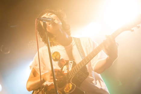 その後、バンドはオレンジの温もりのある照明の下で「イミナシ!」を披露したり、柔らかなアコースティックギターの調べと、りょーめーの情熱的な歌声が溶け合う「うたかたの日々」をパフォーマンスしたり、自分たちのレパートリーの中でもしっとりとしたナンバーをプレイ。さらに、再スタートの思いを歌詞に込めた新曲「A.IR」が始まると、オーディエンスは歌詞を噛みしめながら5人のアンサンブルを真剣に聴き入った。新曲を歌い終えたりょーめーは、「ありがとうございました!」とバンドを代表して挨拶したのち、「うっしゃ!」と力強くガッツポーズを決めた。
