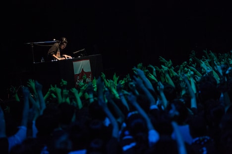 そんな彼らの前にまず登場したのは、ゲストアクトのPUNPEEだ。彼はDJセットの前に陣取るやNirvana「Smells Like Teen Spirit」、Jamiroquai「Supersonic」、椎名林檎「丸の内サディスティック」、Dragon Ash「Life goes on」、ゆらゆら帝国「美しい」の音源にカラフルなビートをマッシュアップしたトラックをつなぎまくるDJプレイを展開。RADWIMPS「DADA」のリミックスバージョンや、「いいんですか?」に加山雄三 feat. PUNPEE「お嫁においで 2015」をマッシュアップしたトラックではフロアの大合唱を巻き起こしてみせた。