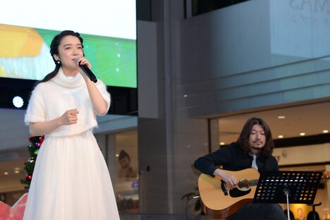 真っ白の衣装に身を包んだ上白石は、ステージに現れるとまず「Silent Night」をアカペラで歌唱。優しい歌声で集まった観客や通行人を引き付けていく。歌い終えた彼女が「『SUNSHINECITY Colorful CHRISTMAS』スタート!」と高らかに宣言すると、噴水が高く昇り天井に吊るされたツリーが点灯した。その様子を眺め上白石は「すごいですね! ちょっと鳥肌が立ってしまいました」と目を輝かせる。