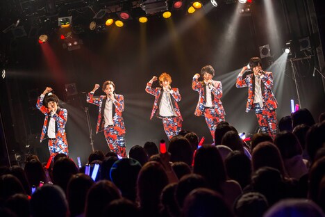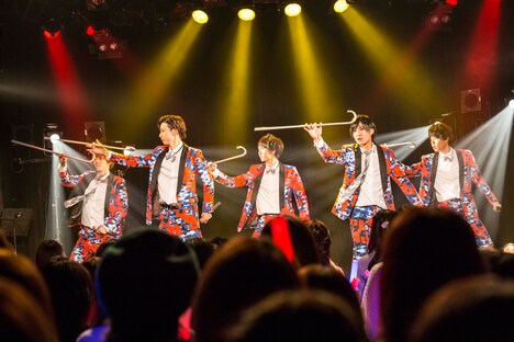 5曲をノンストップで歌い終えると最初のMCへ。メンバーが口々に「待ちに待ったワンマンライブです」と感慨深そうに語る中、末吉9太郎は茶目っ気たっぷりに「1曲目からかわいいがあふれて止まりません。誰か助けてください!」と発言し、場内の笑いを誘っていた。MC後に披露された「New days」では、5人がステッキを手に軽快なステップを披露。またライブ中盤にはメンバーが街ロケに挑戦した企画映像が上映されたほか、「Can't Take My Eyes Off You」「Now That We Found Love」の2曲で5人はマイクを持たずにダンスを繰り広げるなど、ワンマンライブならではの内容でファンを楽しませていた。このほかバンドメンバーをステージ上に迎え、生演奏をバックに「Forever」「Samenaide」の2曲をパフォーマンス。オーディエンスは手拍子を打ちながら体を揺らして、歌と踊りを楽しんでいた。