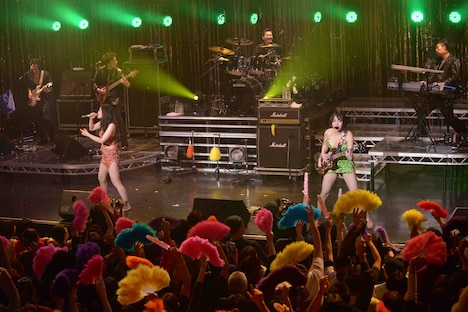 数多くの風船が飛び交った「真夜中のディスタンス」、ボックスステップとヒゲダンスでまいとかおりがステージ中を駆け巡った「白黒つかない」を終えると、かおりは赤坂BLITZの思い出を語る。「初めて行ったライブハウスがここで。まだ小4のときにどーしてもイキたい……って母親に駄々こねて行ったPENICILLINのおギグだったの」と感慨深そうに振り返っていた。そして後半戦ではフロア中に“フワフワ”コールが飛び交った「♂×♀×ポーカーゲーム」、SHOW-YAのスピーディなメタルナンバー「私は嵐」「限界LOVERS」を立て続けに演奏。熱気冷め止まぬ中本編を終えた。
