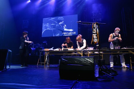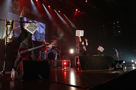その後は、喜矢武が残った食材を頬張りながらエアギターを披露したり、全員がそろってシャウトしたり、ステージをところ狭しと跳び回ったりと熱演を繰り広げる。アンコールでは鬼龍院が「AbemaTV、1周年おめでとうございます」とお祝いの言葉を述べ、「楽しかった!」とこれまでの時間を振り返る。また舞台の合間を縫ってのライブとなった喜矢武は「リフレッシュになった」と満足げ。最後に4人は代表曲「女々しくて」を全身全霊で届け、鬼龍院の「最高だった!」という言葉でライブを締めくくった。