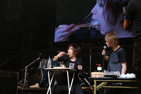 この時点ですでに会場は大盛り上がりだったが、ひさしぶりのワンマンライブということでバンドは、鬼龍院がバラードを歌っている間にほかのメンバーが料理をするという前代未聞のパフォーマンスに挑戦。スタッフの手で続々と調理器具や食材がステージに運び込まれていく中、喜矢武は寿司、歌広場は餃子、樽美酒はイカ飯を作ることを宣言する。鬼龍院は「手だけは除菌してよ!」「大丈夫? 作ったことあるの?」とテンションが低いまま「片想いでいい」を歌い始めた。鬼龍院が歌う横で、喜矢武は酢飯をうちわで扇ぎ、樽美酒は不慣れな手つきでイカの内臓を取り出し、歌広場は餃子を皮から作る。鬼龍院はときおり訝しげに横に視線を送り、メンバーのちょっかいをかわしつつ、「君がいない間に」「忙しくてよかった」「さよなら、さよなら、さよなら」を続けて熱唱。切ない歌声が響く中、酢飯やイカ飯、生魚の匂いが場内にじわじわと広がっていった。