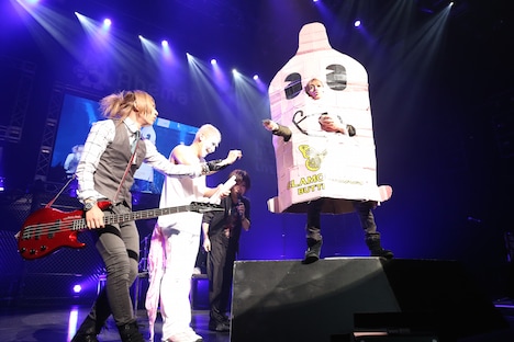場内が暗転するなりメンバーが勢いよく登場し、鬼龍院翔(Vo-karu)の「どーもー、こんばんはー」という挨拶でライブの幕が上がる。そして4人が1曲目に届けたのは最新曲「#CDが売れないこんな世の中じゃ」。喜矢武豊(Gita-)がギターの背面に貼ったAbemaTVのシールをアピールしたり、メンバー全員でQRコードを印刷した箱を被って激しく踊ったりとのっけからフルスロットル状態でパフォーマンスを展開する。さらに喜矢武が「今日は生中継だから下ネタはやりません」と宣言するも、それを無視するかのように樽美酒研二(Doramu)がズボンを脱ぎ、Tバック着用のお尻をカメラに向かって見せつける。開始10分も経たずに場内にはゴールデンボンバーらしいカオスで自由なムードが漂った。