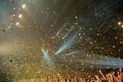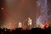 続く「宇宙飛行士への手紙」は、波間のような青いモザイク模様が紗幕に広がる中、増川の丁寧なトレモロからスタート。そして藤原が冒頭のAメロを歌い終えると同時に、ステージを隠していた幕が振り落とされ照明が明るくなり、金色のラメが特効でアリーナ上空に振りまかれる。アリーナクラスのライブらしいスペシャルな演出に、場内のあちこちから喝采が起こった。さらに心が浮き立つようなミドルナンバー「HAPPY」、一転してシリアスな世界観で魅せる「ゼロ」と、バンドの持つ多面性を楽しめる楽曲が惜しみなく演奏される。また「ゼロ」では、ステージ後方スクリーンにバレエダンサーと鳥、そして戦いをモチーフにした切り絵のような映像を投影。藤原の哀切な歌声と相まって、切ない雰囲気で会場を満たした。