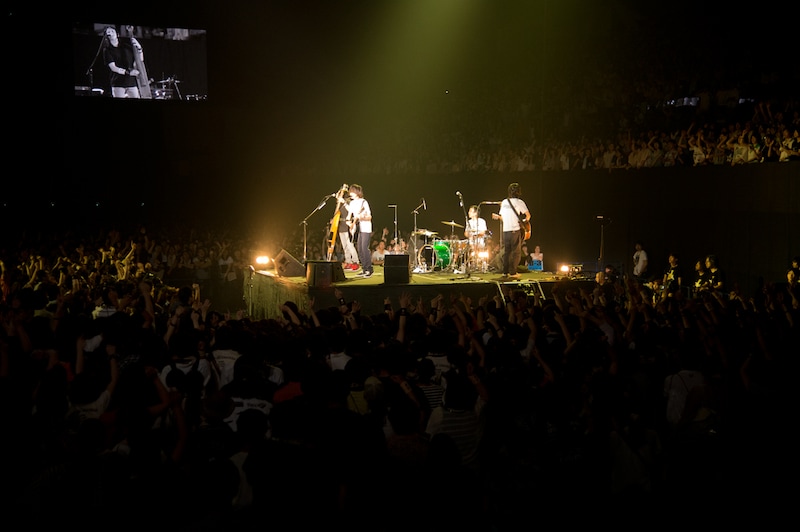 さらに歌のパートが終わり、特徴的なギターリフが鳴り始めると、後方スクリーンに新たな映像が投影される。アリーナツアー序盤から中盤では花畑の映像が使われていたが、この日はマンガ家の井上雄彦が特別に描き下ろしたイラストをもとにした作品に。ペンで真っ白い画面を塗りつぶすように、人物がひとり描かれ、草が生まれ、地面が生まれ、高い草が生え揃い、足下は茂みになっていく。孤独だった人物と向かい合うように2人目が描かれる頃には、バンドの演奏もより激しさを増していく。ドラム台の前にフロント3人が集まり、お互いを見やりながら演奏を続ける。そのあいだにも画面の密度は増し、人物が3人、4人、5人と増え、女性や子供や老人と思われるシルエットが描き込まれ、ふと気付くと一番初めに描かれた中央の人物が隣に立っている子供と手をつないでいる。そしてさらに人が増え、画面前方から子供が元気よく駆け寄り、喜びが生まれていく。最後には多数の描き込みで塗りつぶされるかのように真っ黒になったキャンパスが一瞬映されると、ぷつっと映像が終わってしまう。命のはかなさと生きる喜びを表したかのような映像表現と演奏を前にして観客は絶句し、そしてすぐさま歓声で応えた。