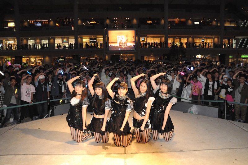 これは9nineが行っている企画“9nine「Evolution No.9」拡散計画”の一環として実施されたもので、台風3号の影響で不安定な天気の中、大勢のファンが会場に駆けつけた。ミニライブはまず新曲「Evolution No.9」からスタート。黒を基調とした衣装を身にまとったメンバー5人は、本人たちが“がに股ダンス”と呼ぶ特徴的なダンスを披露しながら会場を盛り上げていった。
