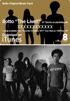 販売されるのは彼らのツアー「Counter Creation 1977」のファイナルとなる、12月14日のLIQUIDROOM ebisu公演の音源。当日ライブ会場にて購入できるiTunesカードに記載された12桁のコードを入力すると、後日iTunes Storeで「8otto "The Live!!" '07 TOKYO at LIQUIDROOM」をダウンロードすることができる。カードは88枚のみの限定発売。
