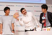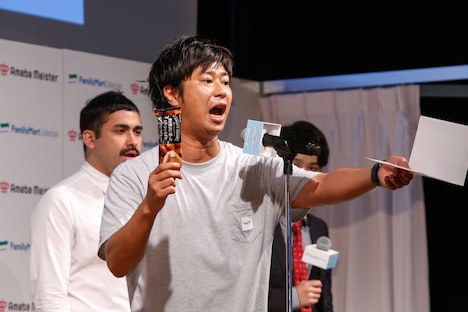 結果は、マイクを通すのも忘れてロッテアイス「SWEETS SQUARE シリーズ」の魅力を紹介したパンサー尾形の勝利。豪華賞品が何なのか期待していた尾形は、それが「菊地からの『あーん』」だとわかるとずっこけてみせ、「アイスはおいしいけど、これは罰ゲームだろ!」とコメントして笑いを誘った。
