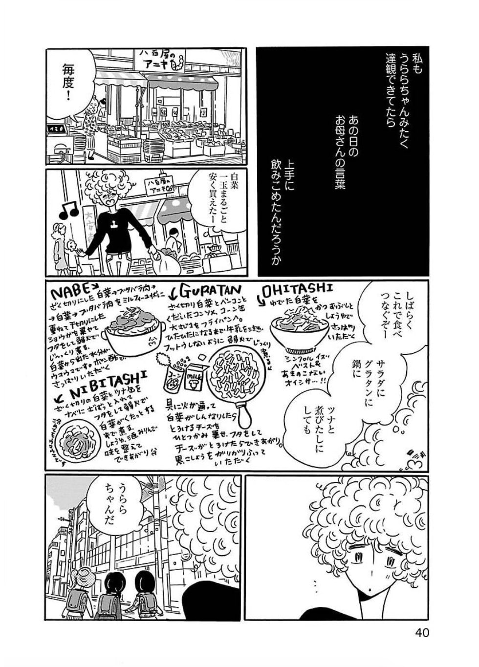 「凪のお暇」2巻収録の8話に登場。ご近所に住む母子家庭の少女・うららちゃんを見ながら、凪は自分と母の関係を思い出す。そんな中、八百屋で白菜を一玉まるごと購入した凪は、いろんな白菜料理を思い浮かべる。