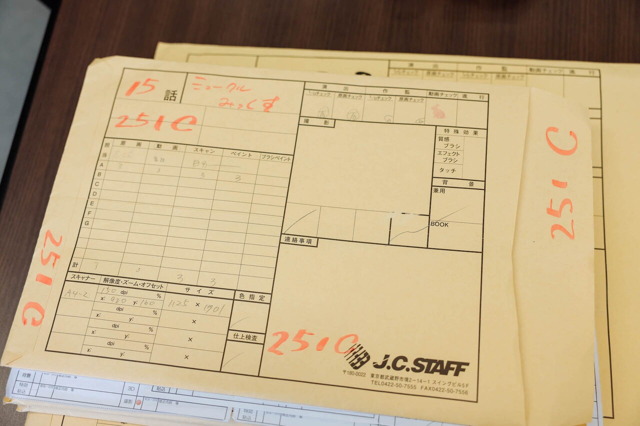 動画の作業中、机にずっと置かれていたカット袋(原画や動画などの素材を入れて運ぶための袋)。テレビ番組のロケで学んだそうで、鶴房さんはカット袋に書かれた数字の意味を得意げに教えてくれました。このカット袋の場合は、第15話の251番目にくるカットということを表すそうです。