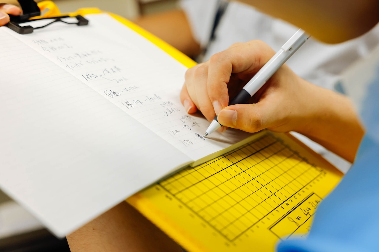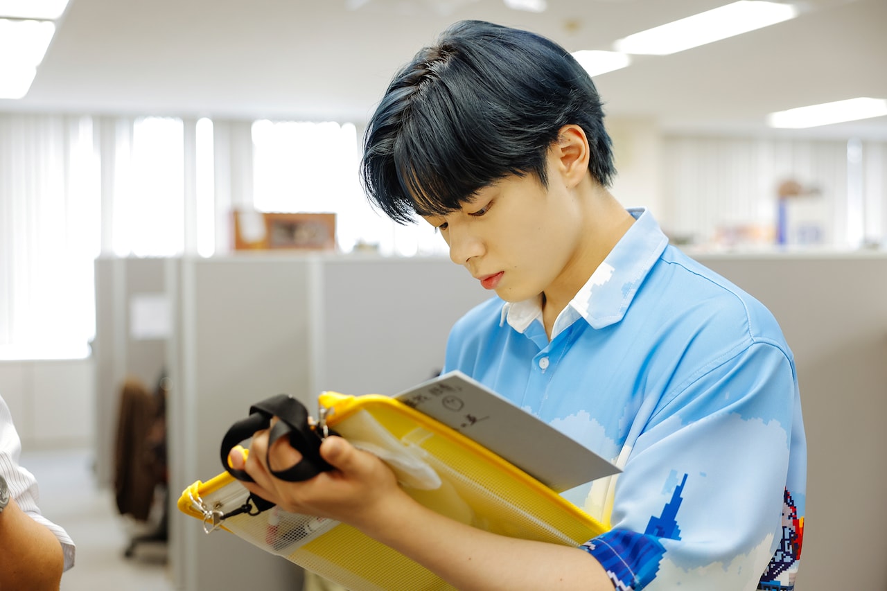 鶴房さんが持っているのは、第1回のインタビューでお渡ししたノートと観察用ボード。今日の取材でアニメプロデューサーの仕事に役立つことを学んだら、このノートに随時メモしていっていただきます。