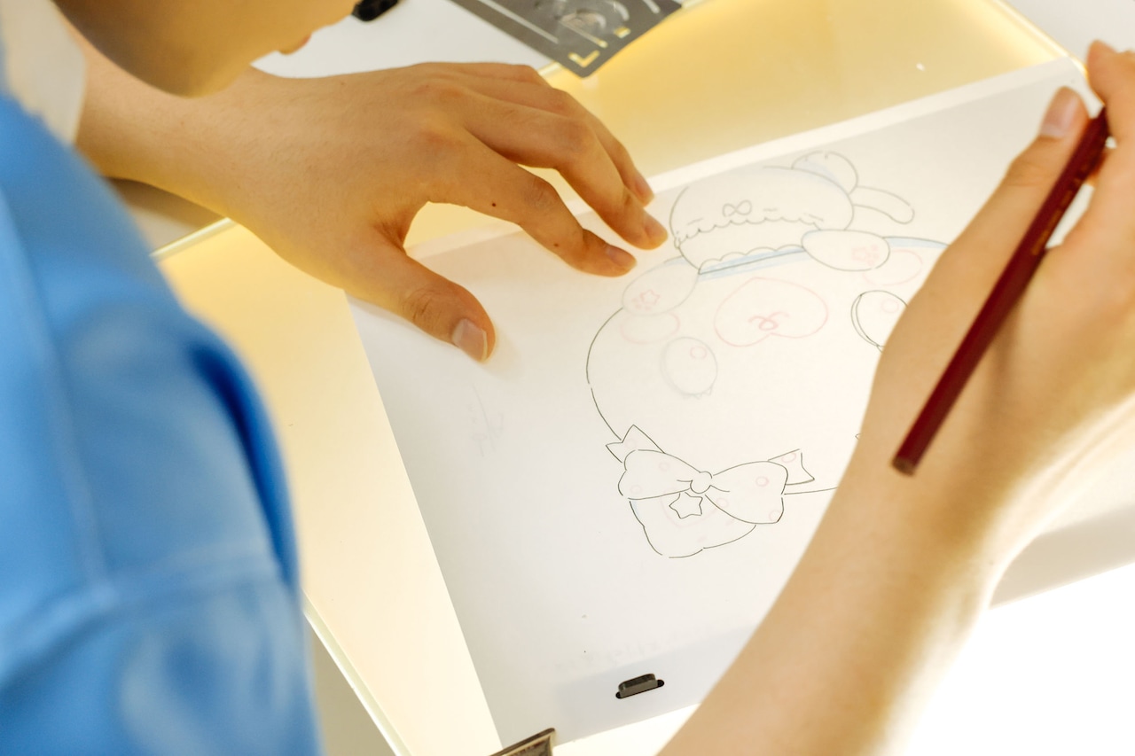 内藤玲 まずは原画をタップ(紙がずれないように留める、文鎮のような道具)にセットして、その上から真っ白の作画用紙を重ねます。トレス台の電気をつけると、下からの明かりで原画が透けて見えるようになりますよね。これでトレスができるようになります。