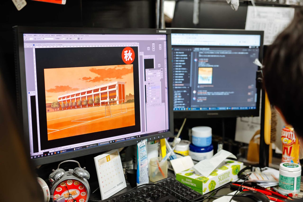 作品の美術背景を制作する部署。昔は画用紙に筆とポスターカラーを使って描くというアナログな手法だったそうだが、現在はほぼ100%パソコン作業に。2Dのほか、最近では3Dで背景を作ることも増えている。