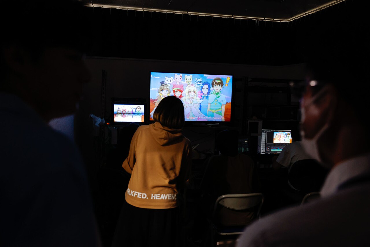 見学を終えて部屋に戻ろうとしたとき、真っ暗な部屋でちょうどラッシュチェックが行われていました。ラッシュチェックとは完成映像をチェックし、映像に間違いがないかと、指示通り撮影されているかを確認し、リテイク出しを行うこと。新人だとリテイク箇所を見つけるのは難しいそうですが、鶴房さんは早々に“パカ”を発見していました。