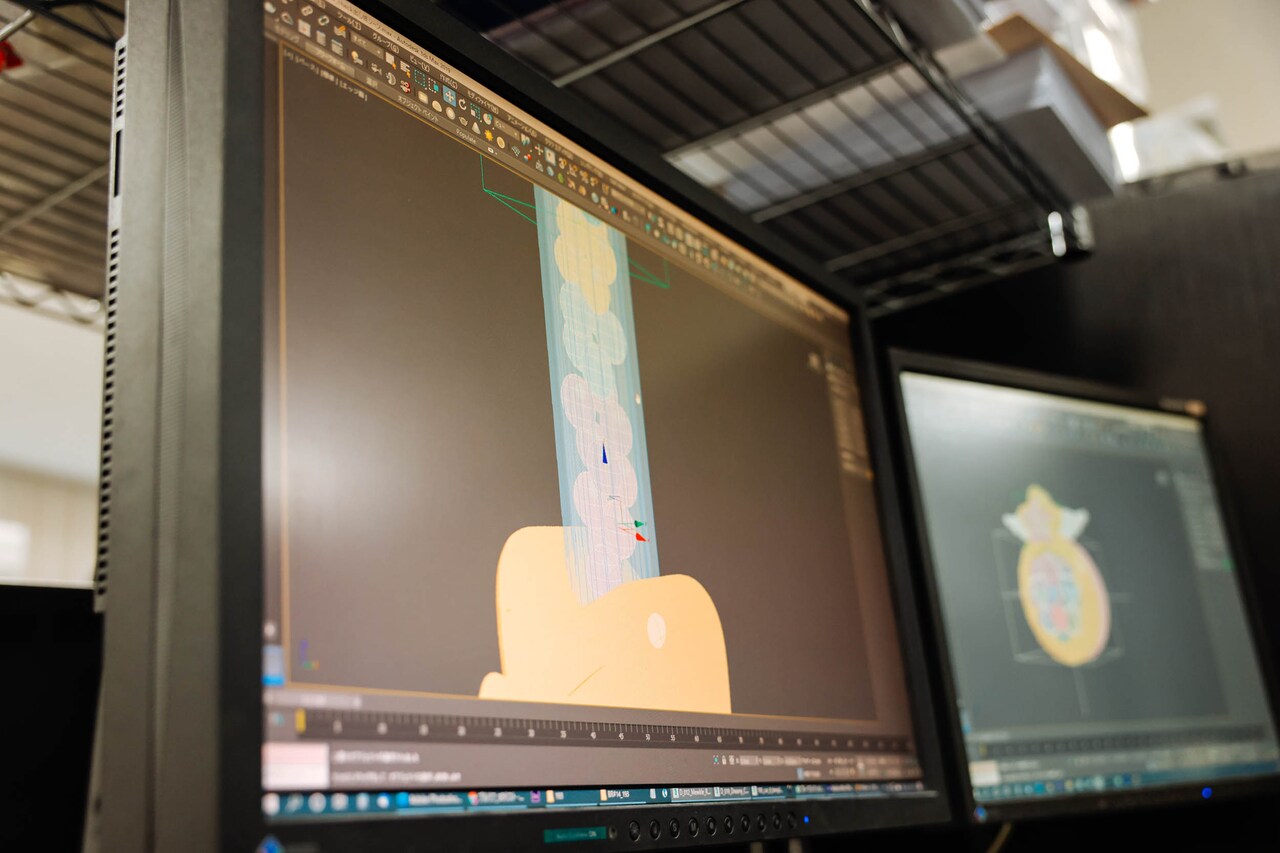 キャラクターや背景、特殊効果など、従来の作画だけでは難しかった映像を3DCGで制作する。中でもデザイングループはスマートフォンやパソコン、ゲームの画面から、食品パッケージ、雑誌の表紙まで、さまざまな小物のビジュアル作りを担当。CGは表現の幅を広げるだけでなく、一度モデリングさえしてしまえば作業効率を格段に上げられることも可能にする。