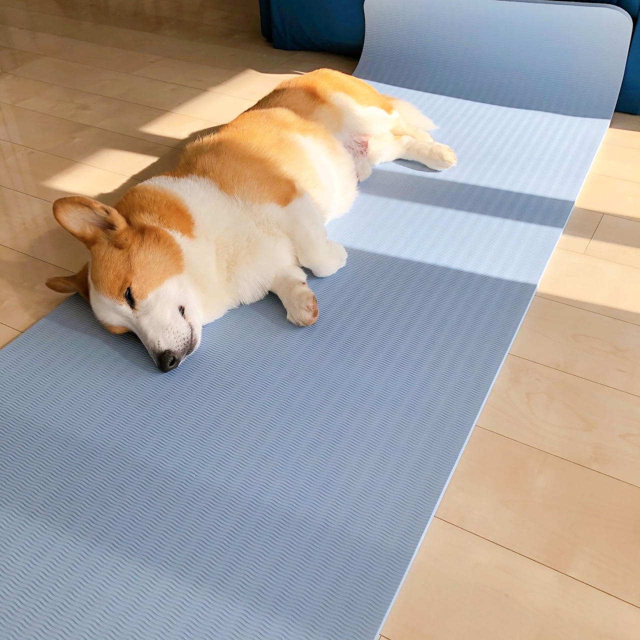犬用ベッド→ソファ→ブランケットの上→ヨガマットの上……と、自分の居心地がよい場所を次々と見つけてお引越ししながらひたすら眠っています。