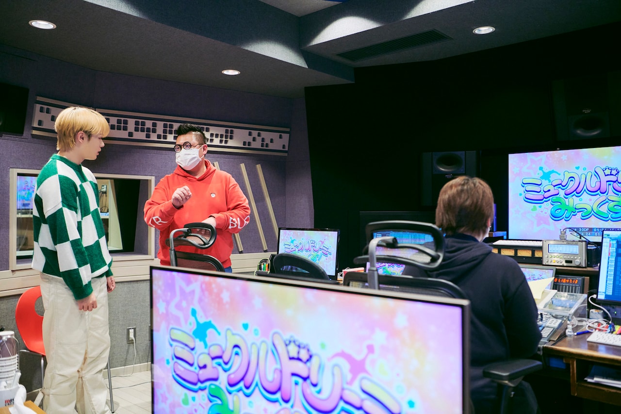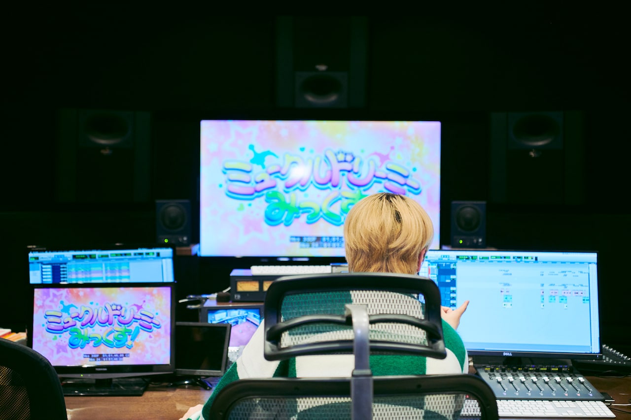 ここで調整室にぞろぞろと人が集まってきました。というのも、今日は「ミュークルドリーミー みっくす!」第48話の収録日。音響監督の明田川仁さん、監督の桜井弘明さん、プロデューサーの松倉さんらが席につくと、現場の空気が一気に引き締まります。鶴房さんも見学させてもらうことになりましたが、関係者以外の会話は厳禁のため静かに見守ります。