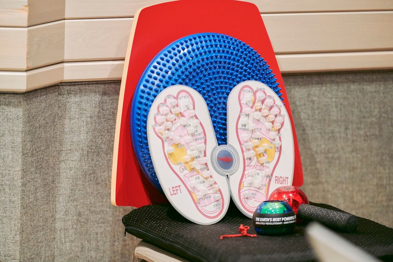 アフレコは長丁場なのでカフェインは必須。どのレコーディングスタジオにもコーヒーマシンは必ず置いてあるという話で盛り上がります。奥のほうには、J.C.STAFFのプロデューサー・松倉友二さんの私物が。これはキャストやスタッフにプレゼントされた健康グッズで、松倉さんはいつもアフレコを見ながら使っているそうです。