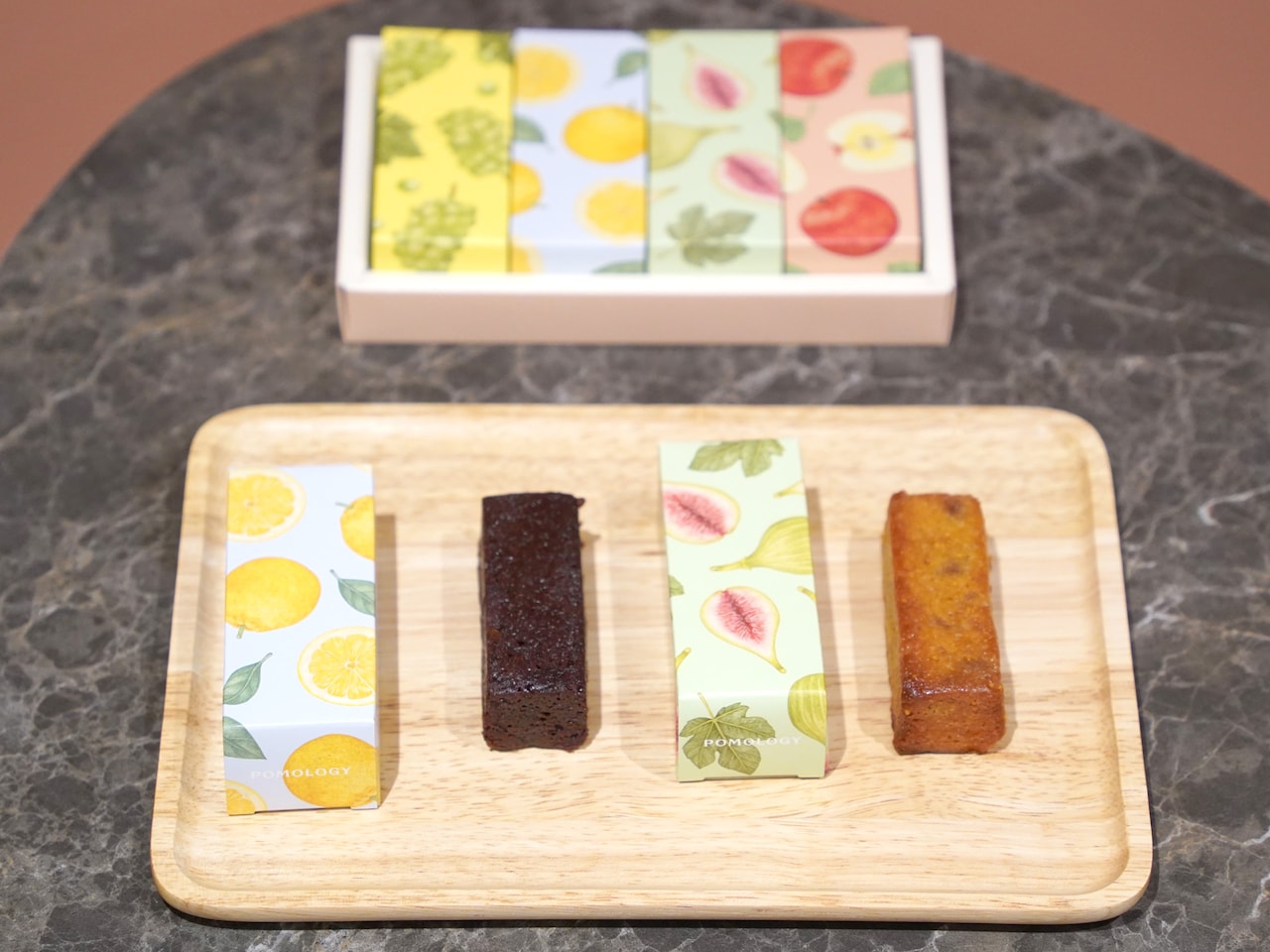 フルーツバーの晩柑ショコラは、しっとりとした濃厚チョコケーキに柑橘の香りが広がり、そして不意に皮の食感が現れて驚きます。ホワイトフィグはいちじくのプチプチした種とグニグニと弾力のある果肉の対比が、リンゴメープルは洋酒とメープルのふくよかな香りの中にフレッシュなりんごの歯ざわりがして、ひとつひとつが一筋縄ではいかないアイデアを感じさせます。