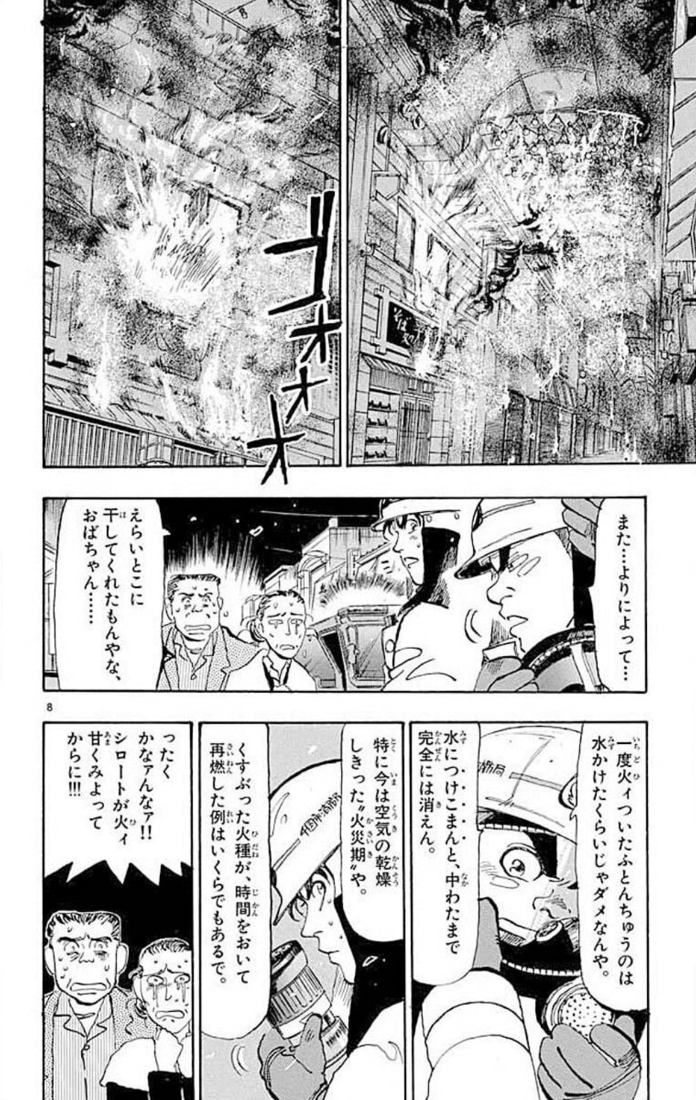 「め組の大吾」は、幼い頃から消防士に憧れていた青年・朝比奈大吾が、地元の消防署であるめだかヶ浜出張所・通称「め組」に配属となったことから始まる消防ストーリー。第3巻収録の「種火参上」「深夜の一騎打ち」では、布団にタバコの火がついたという通報を受けるが到着した頃には鎮火しており、大吾たちの出動は空振りに終わる。しかし一度は消火したはずの布団が夜になって再発火し、大規模な火災へと発展する事態に。一度火がついた布団は中綿がくすぶって危険なため、半日は水に浸さなくてはいけないという注意を住人が無視したためにこの火事は起こってしまった。目の前に火がないと人は油断してしまうということがよくわかる、防火意識が刺激されるエピソードだ。なお同作は続編「め組の大吾 救国のオレンジ」が、月刊少年マガジン(講談社)で連載中。