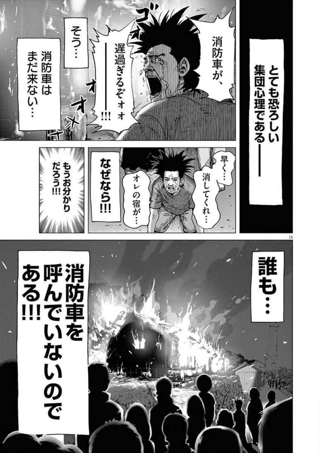 古民家を改修してゲストハウスを作ろうとする友人・村田と、その手伝いをしていた主人公・田中。めでたくゲストハウスがオープンできることになり、田中たちはお祝いの飲み会を始める。そうして全員が酔いつぶれてしまい、気が付くとあたり一面は火の海……。勢いよく燃え上がるゲストハウスを心配した近隣住民も集まり始めるが、一向に消防車はやって来ない。「消防車はまだかー!!!」「なぜ来ないー!!!」と泣き叫ぶ村田。それでも消防車は来ない……なぜなら、誰も消防車を呼んでいないのである! 大勢の人がいるのに、自分以外の誰かが通報をしているに違いないとみんなが思ってしまった結果、いつまで経っても消防車がやって来ないという最悪の事態を描いたこの話は「しあわせアフロ田中」4巻に収録。作者・