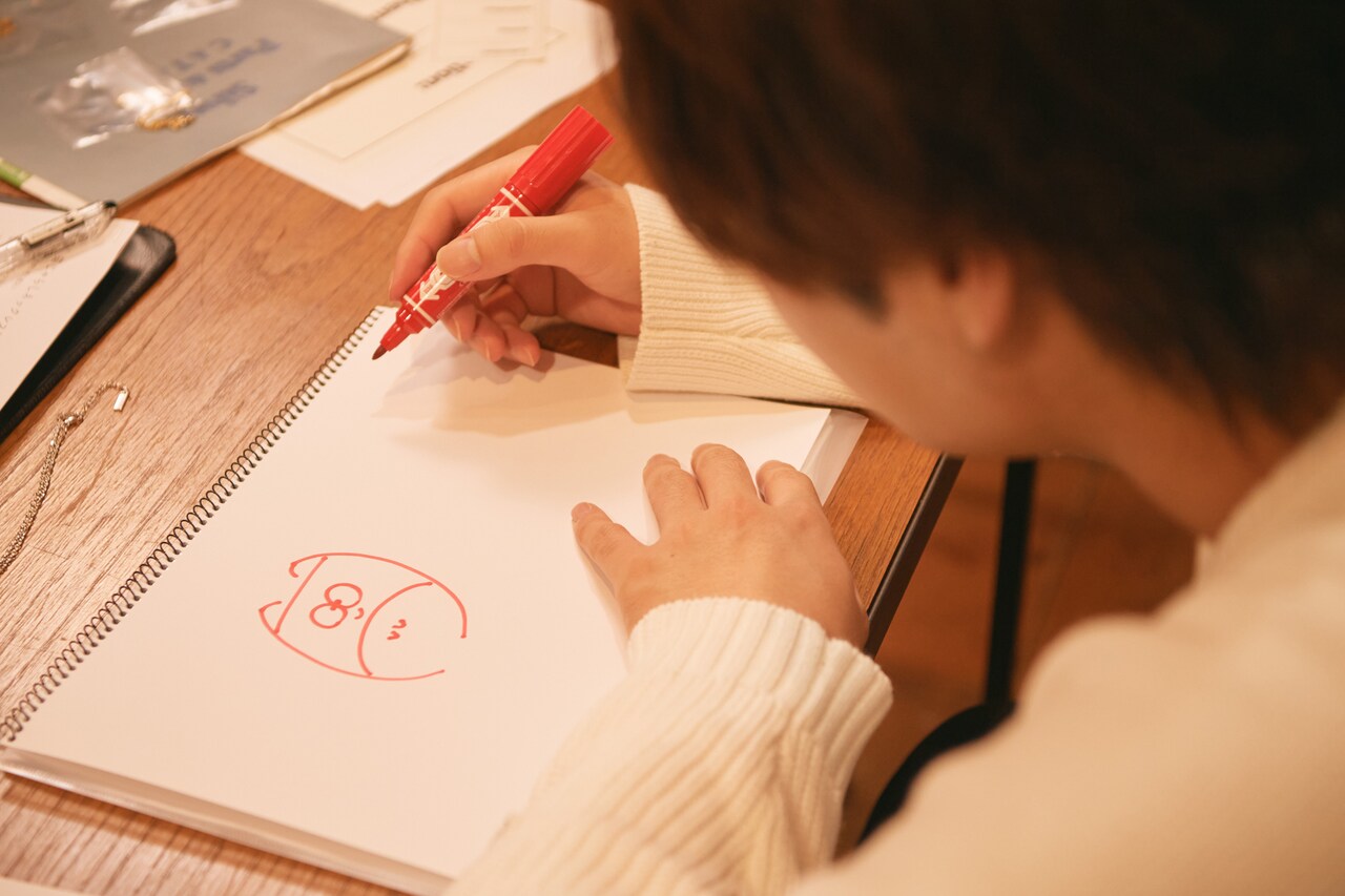 ここでデザイナーが、「だいふくと遊んでいる堀江さん本人を表現したらどうか」と発案。堀江さんのサインをサークルのプレートに刻印することになりました。プレートに収まりがいいものを使えるように何パターンかサインを書いていきます。
