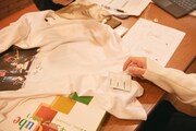 フーディーの襟には、堀江さんのサインとglambのロゴが入ったタグを付けることに。ここで堀江さん、Tシャツのタグ用にサインを書きすぎてしまったせいか、手が思うように動かないというプチアクシデントに悩まされます。