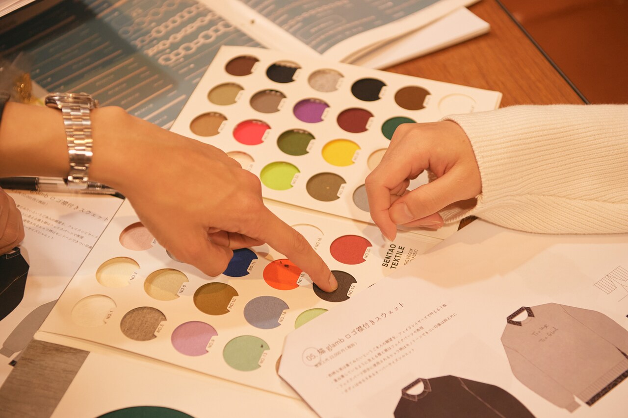 Tシャツとフーディーのカラー展開は定番の白と黒で考えていましたが、スウェットは少し冒険してみることに。色見本を見ながら堀江さんはワイン色をチョイスしますが、照明の違う場所で見ると思っていた色と若干違ったようです。結果、パープルとスミクロ(くすんだ黒)の2色を選びました。