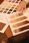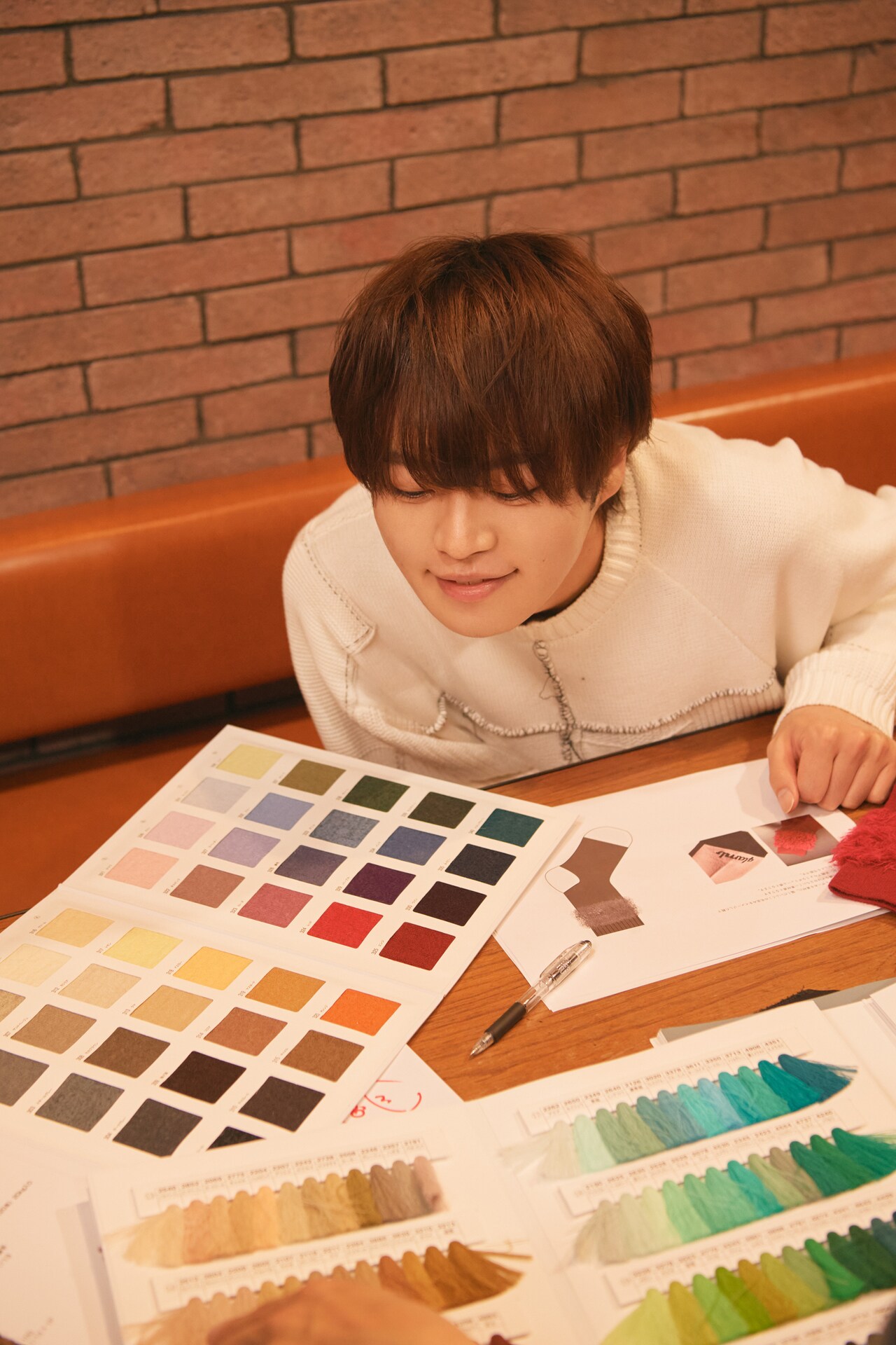 ファーには杢糸(もくいと)という素材を使います。杢糸は1本の中で色の濃淡があるため、ファーにしたときにだいふくの毛並みをよりリアルに表現できるとのこと。堀江さん、先ほどと違う糸用の色見本からベースと極力似た色味を探していきます。種類が多いため時間がかかるのではと予想されていましたが、これが近そうと1発目に言い当てた色がなんとドンピシャ。ここまで色合わせがスムーズにいくことは珍しいようで、glambスタッフはその色彩感覚を絶賛。黒色ファッションに身を包みすぎたせいで「喪服の子」とかつて呼ばれていた堀江さんですが、意外な才能を持っていたようです。