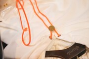 堀江さんのアイデアを活かすべく、Tシャツはネックレスとのセットに。合わせて着用することで、胸元にプリントされた猫がネックレスに戯れているように見えるのがポイントです。また右裾には、堀江さんのプロデュースアイテムであることを証するオリジナルタグをあしらいます。
