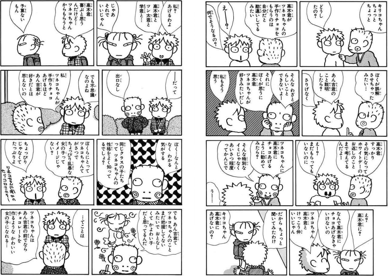 「シニカル・ヒステリー・アワー」は、わがままばかり言う困り者の女子小学生・ツネコちゃんを主人公にしたコメディ作品。家族旅行で出かけた海で偶然に出会った男子・あん吉君に、バレンタインチョコをあげたいとツネコちゃんは思い付く。そんなツネコちゃんの無茶苦茶なチョコ作りに振り回されながら、「ツネコちゃんが手作りチョコあげるほどあん吉君が好きだとは思えない」と頭をひねる親友のキリコちゃん。だけど、あん吉君と同じそろばん教室に通っているツン太君には、なんとなくツネコちゃんの気持ちがわかってしまう。ツン太君は学校では冴えない少年だが、実はそろばん教室ではパンクスの格好をしているのだった。それと同じでツネコちゃんも、普段の自分を知らない相手の前で女の子らしいことをしてみたかったのではないか、と。ツネコちゃんとあん吉君の出会い、そしてこのバレンタイン回を含む一連のエピソードは白泉社文庫版6巻でまとめて読むことができる。