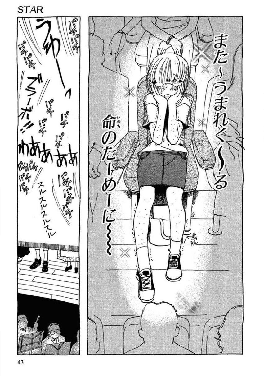 「STAY -ああ 今年の夏も何もなかったわ-」内の「STAR」は、演劇部員の宮薗真保こと宮のエピソードです。西炯子マンガといえば緻密なハッチングで描かれた吸い込まれそうな瞳が印象的ですが、宮は長い前髪とメガネで目が隠れた、地味めな高校生。劇団花鳥風月の俳優・市丸洋史にほぼガチ恋している宮は、夏休みに上京し、劇団の入団試験を受けようと目論みます。宮は気合が入った少し厄介なオタクで、2泊3日で同じ舞台を3回観ようとしたり、出待ちで大声自己アピールしたりするなんてことは序の口で、ついには本屋で遭遇した市丸のシャツをひっつかみ、一緒にお茶にこぎつけてしまいます。宮が本領発揮とばかりに、息を切らしながら早口でファン歴を語るシーンでは、「もう誰か止めたれよ!」といたたまれなくなりウワーッ!!となりました。