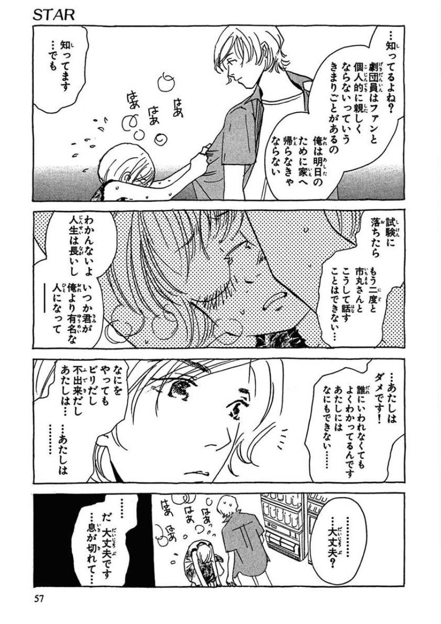 宮は「みんな意識が低いっていうかとりあえずお芝居のまねごとができればいいと思ってて」「…意識が …低いんです」と演劇部のあり方にエラそうな発言をします。その一方で、ファンとの距離を保つべく去ろうとする市丸の服を、宮はまたつかんで「試験に落ちたらもう二度と市丸さんとこうして話すことはできない…」「…あたしはダメです! 誰にいわれなくてもよくわかってるんです あたしにはなにもできない……」「なにをやってもビリだし不出来だし あたしは… …あたしは………」と、胸の内をぶちまけます。彼女の多弁や市丸にすがりつく態度が、実は不安と自信のなさの裏返しだったことがわかり、私は心が痛くなりました。