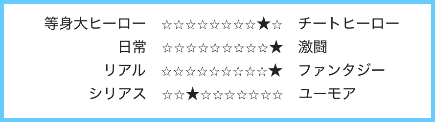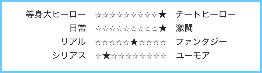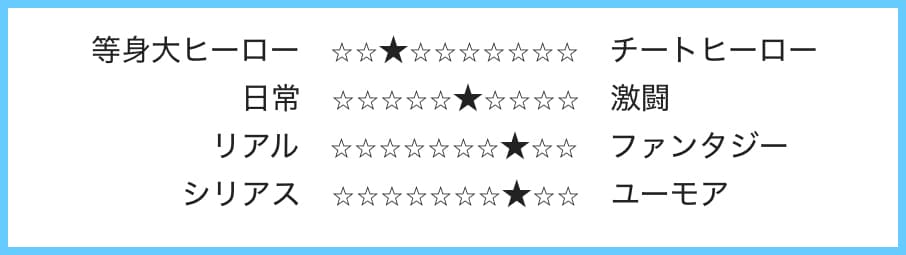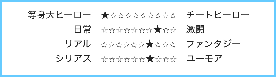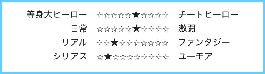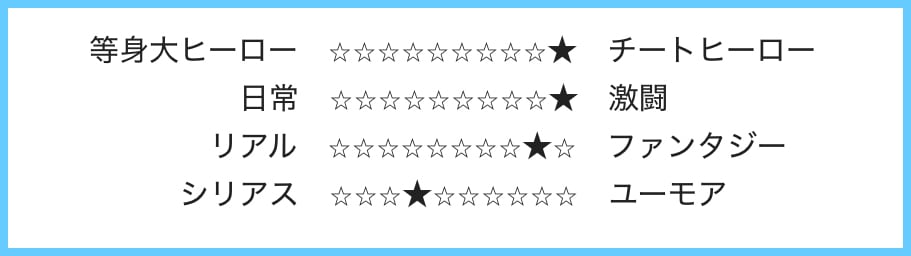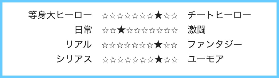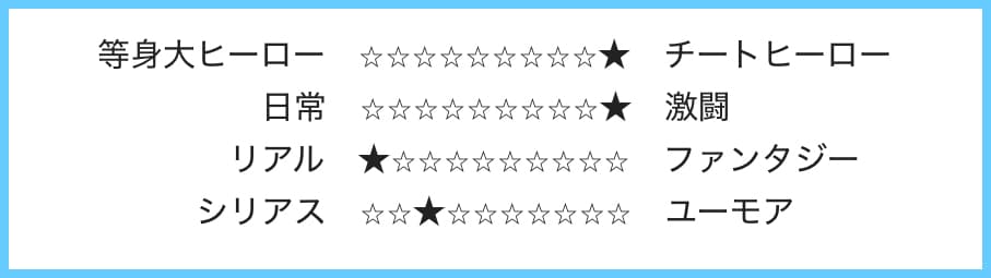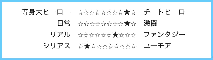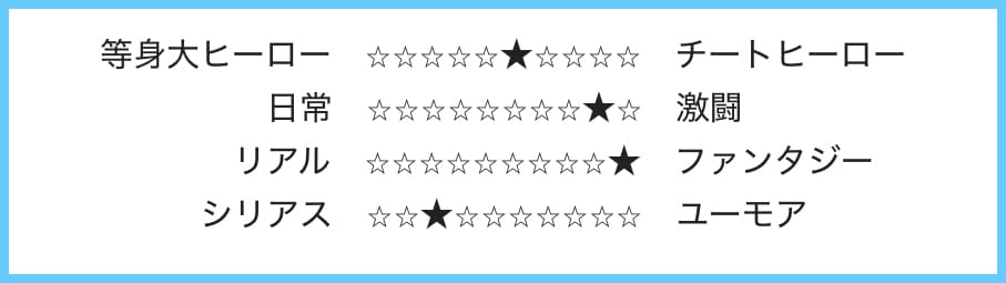 どれに投票すれば迷っている人に向け、この記事ではノミネート作品の中から男性に人気のタイトルを紹介。「等身大ヒーロー/チートヒーロー」「日常/激闘」「リアル/ファンタジー」「シリアス/ユーモア」という4つの軸で、どちらのタイプに近いかを10段階で作品元に自己分類してもらった。