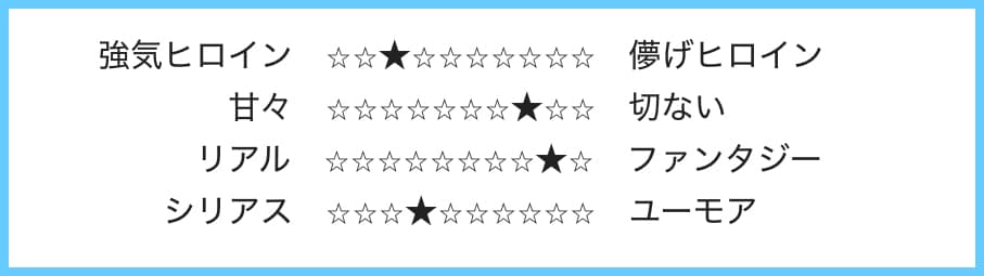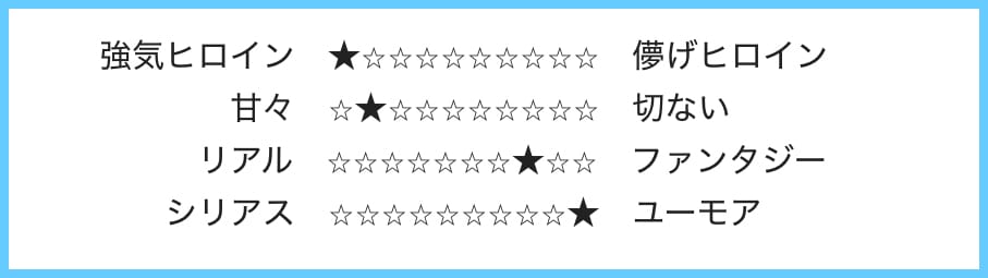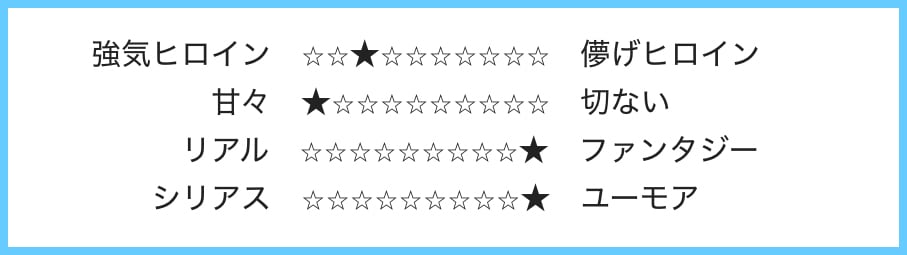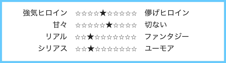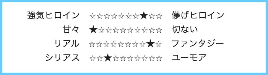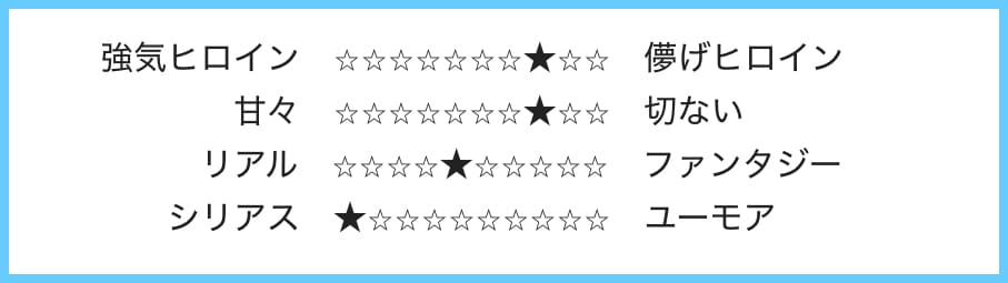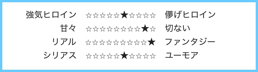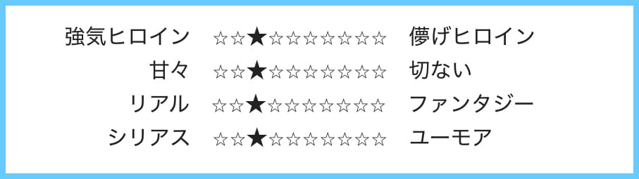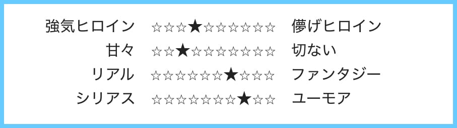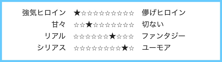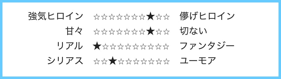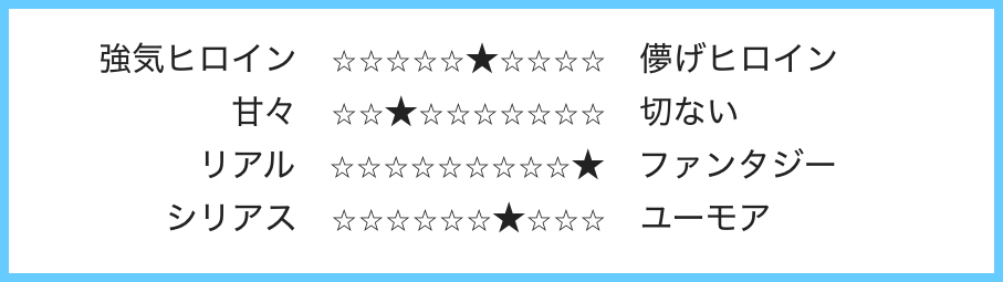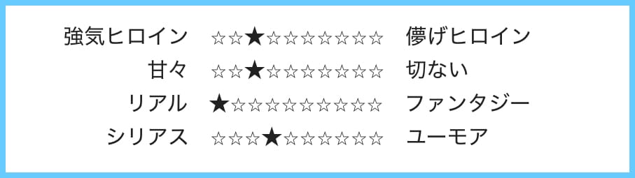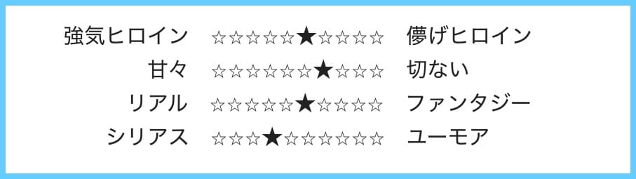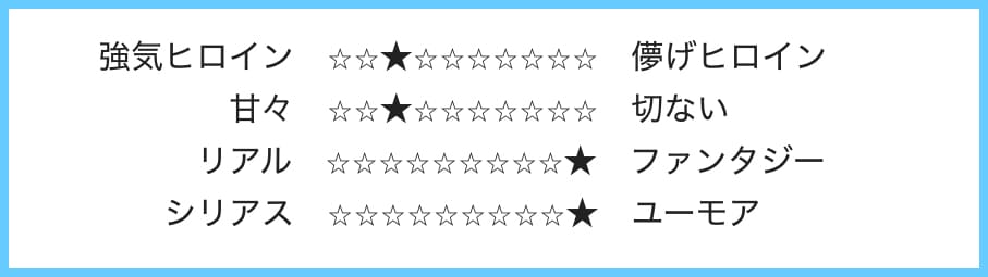 どれに投票すれば迷っている人に向け、この記事ではノミネート作品の中から女性に人気のタイトルを紹介。「強気ヒロイン/儚げヒロイン」「甘々/切ない」「リアル/ファンタジー」「シリアス/ユーモア」という4つの軸で、どちらのタイプに近いかを10段階で作品元に自己分類してもらった。