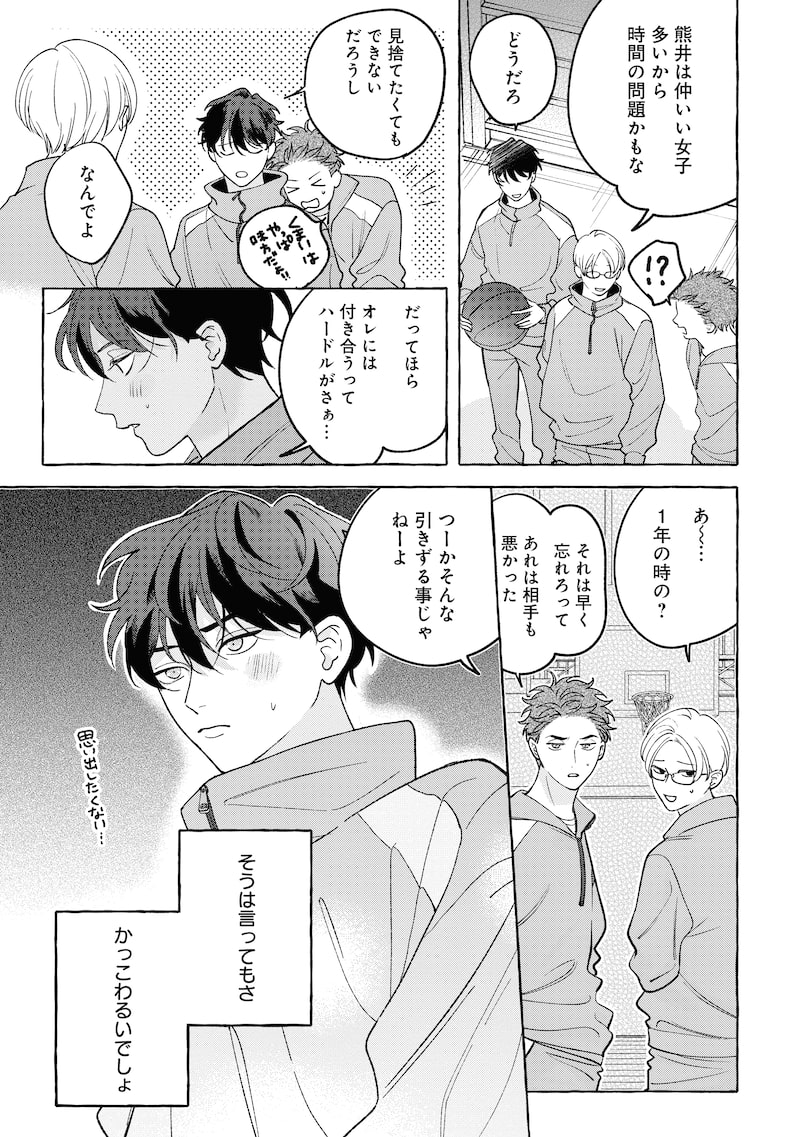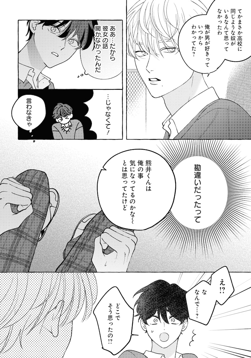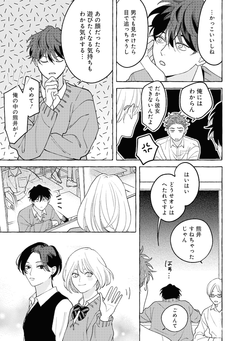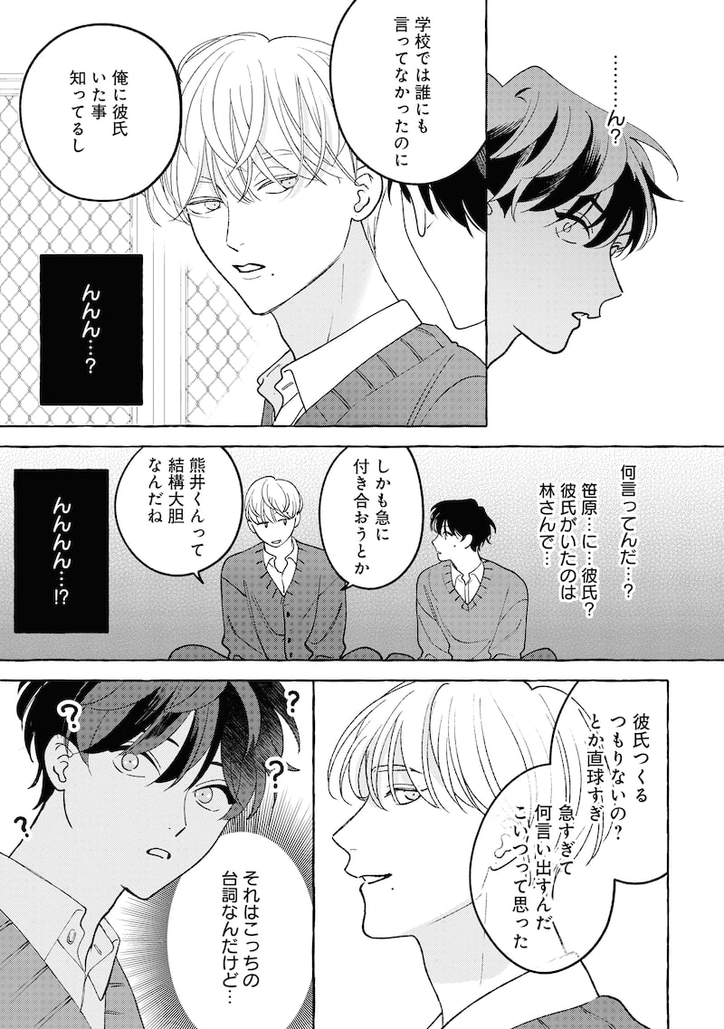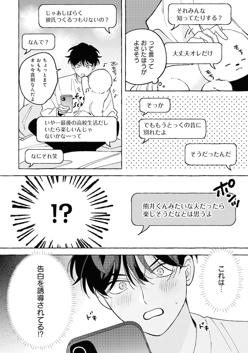 高校3年生の熊井は、彼女を作って最後の青春を謳歌したいと思いつつ、過去のトラウマからなかなか一歩踏み出せずにいた。そんなある日、仲のいい女子が最近彼氏と別れたと聞きスマホで連絡してみると、とんとん拍子でお付き合いすることに。意気揚々と待ち合わせ場所に向かうと、そこに現れたのは学校一のモテ男子・笹原。どうやら熊井は、間違えて笹原にメッセージを送っていたようで……。