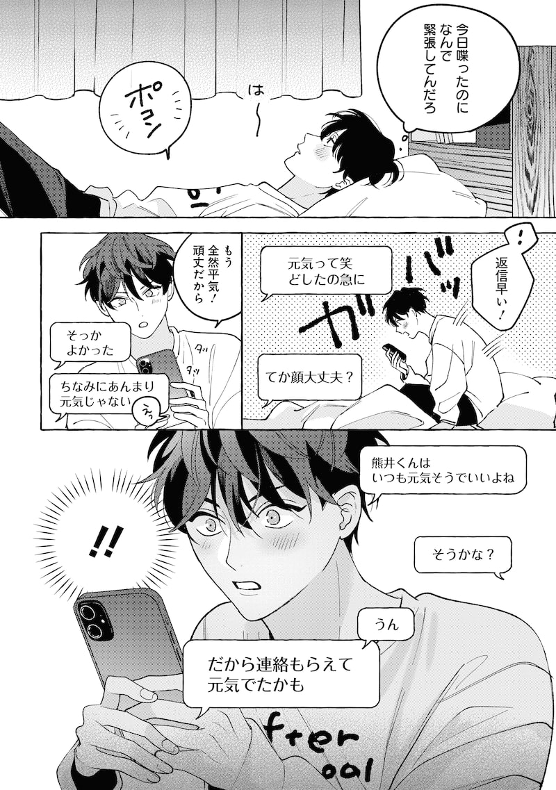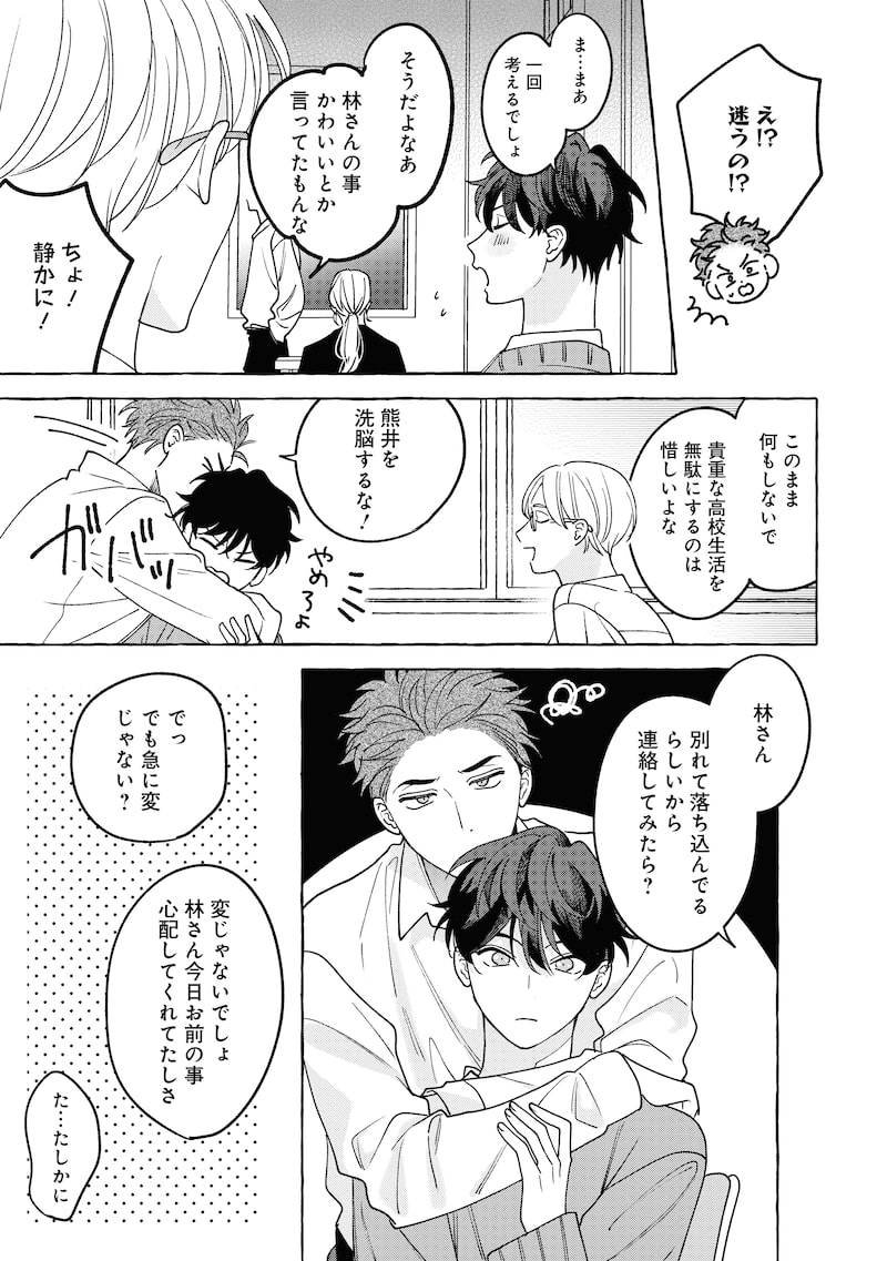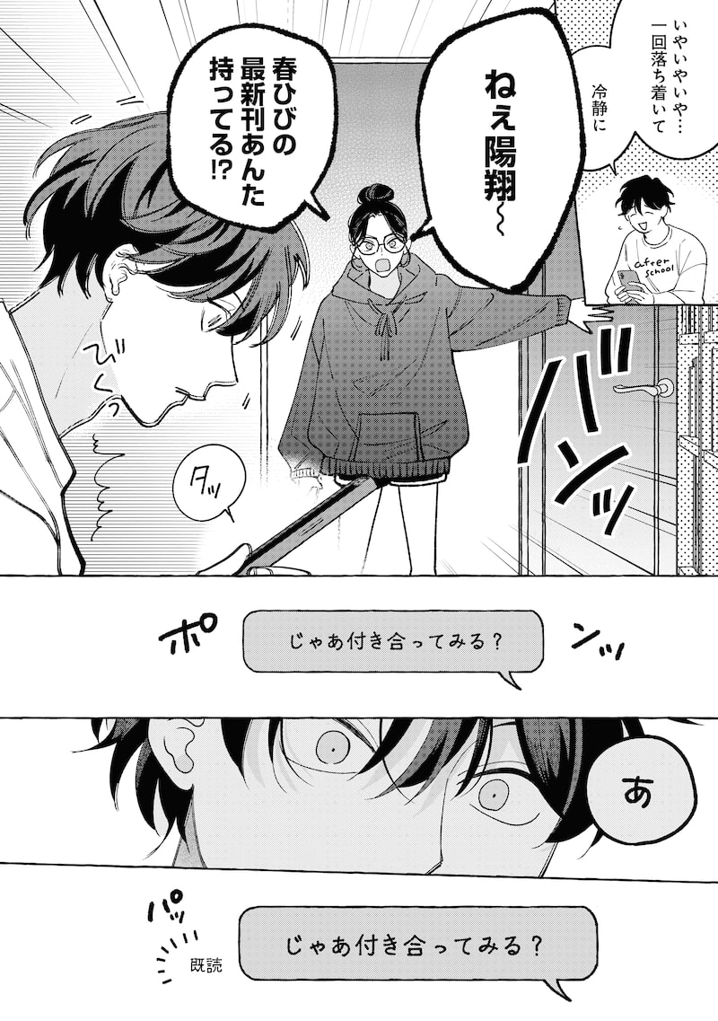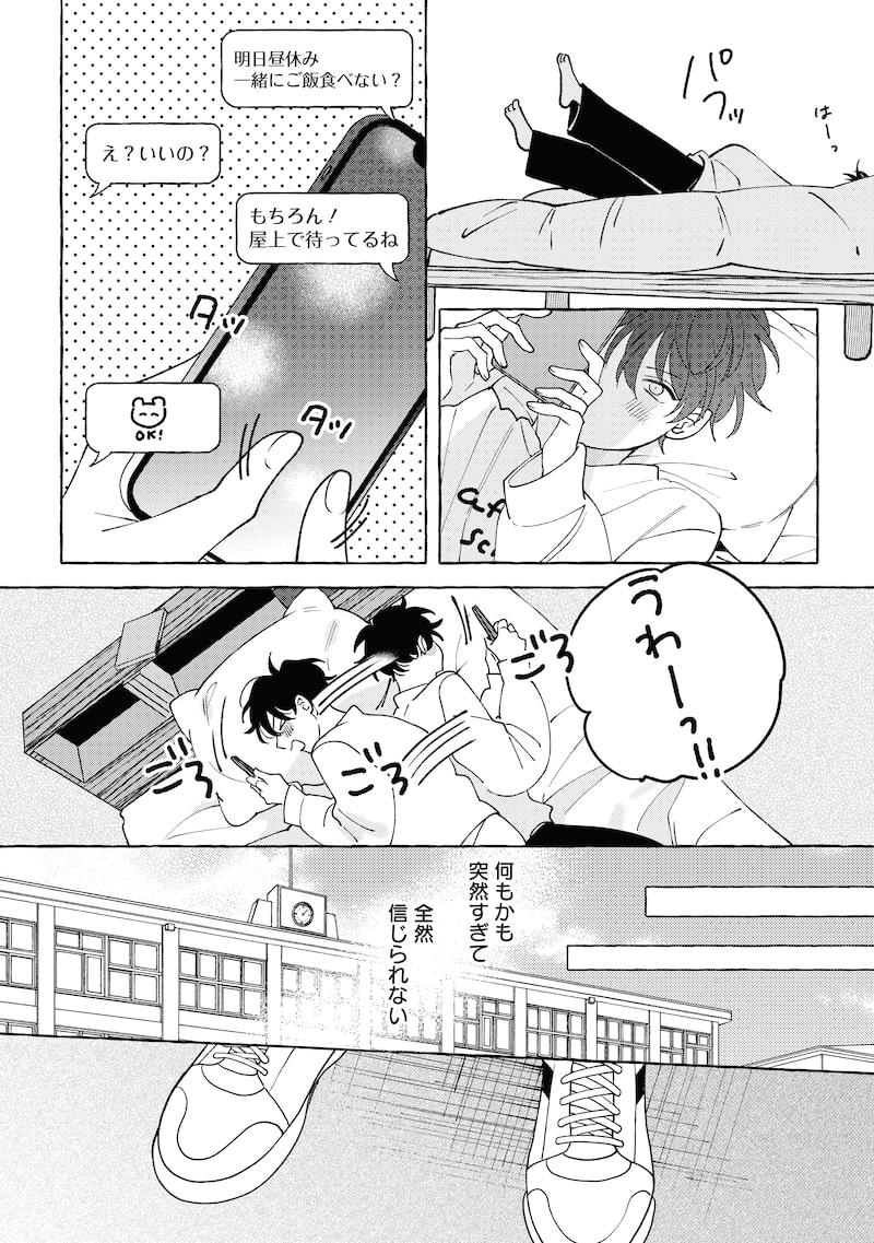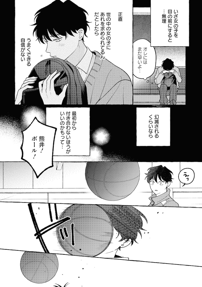高校3年生の熊井は、彼女を作って最後の青春を謳歌したいと思いつつ、過去のトラウマからなかなか一歩踏み出せずにいた。そんなある日、仲のいい女子が最近彼氏と別れたと聞きスマホで連絡してみると、とんとん拍子でお付き合いすることに。意気揚々と待ち合わせ場所に向かうと、そこに現れたのは学校一のモテ男子・笹原。どうやら熊井は、間違えて笹原にメッセージを送っていたようで……。