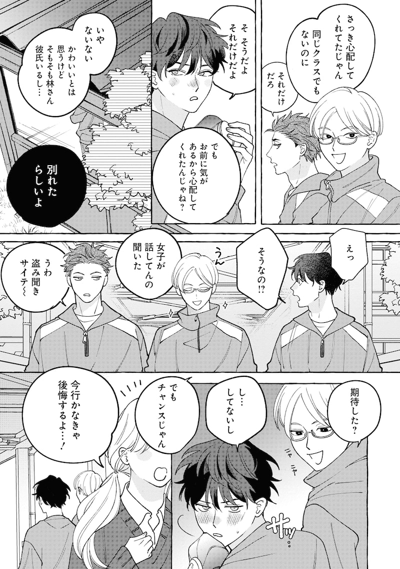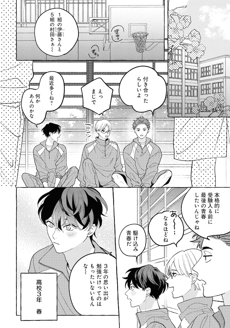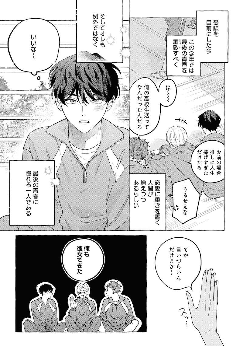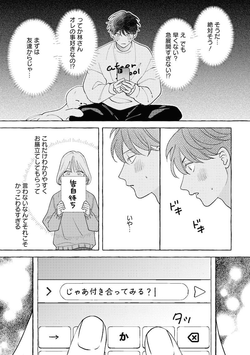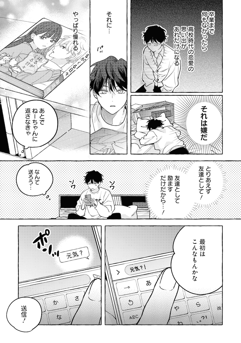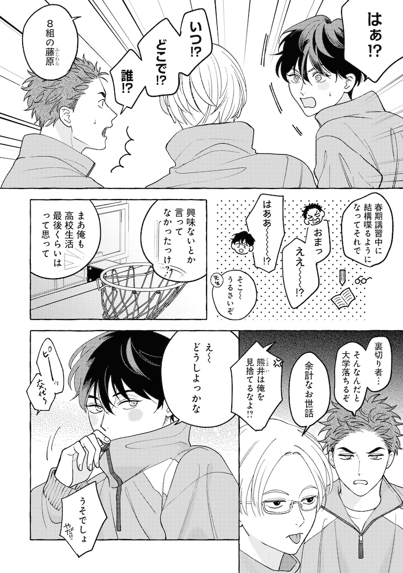 高校3年生の熊井は、彼女を作って最後の青春を謳歌したいと思いつつ、過去のトラウマからなかなか一歩踏み出せずにいた。そんなある日、仲のいい女子が最近彼氏と別れたと聞きスマホで連絡してみると、とんとん拍子でお付き合いすることに。意気揚々と待ち合わせ場所に向かうと、そこに現れたのは学校一のモテ男子・笹原。どうやら熊井は、間違えて笹原にメッセージを送っていたようで……。