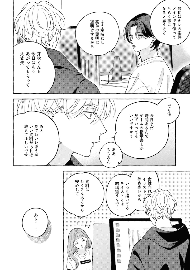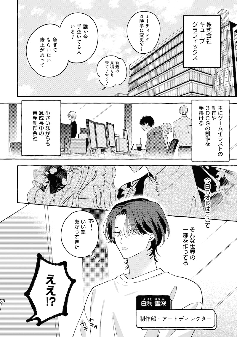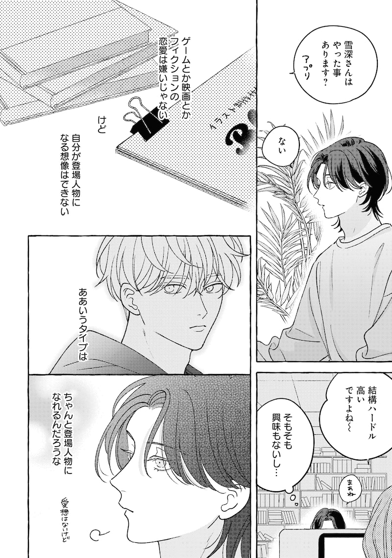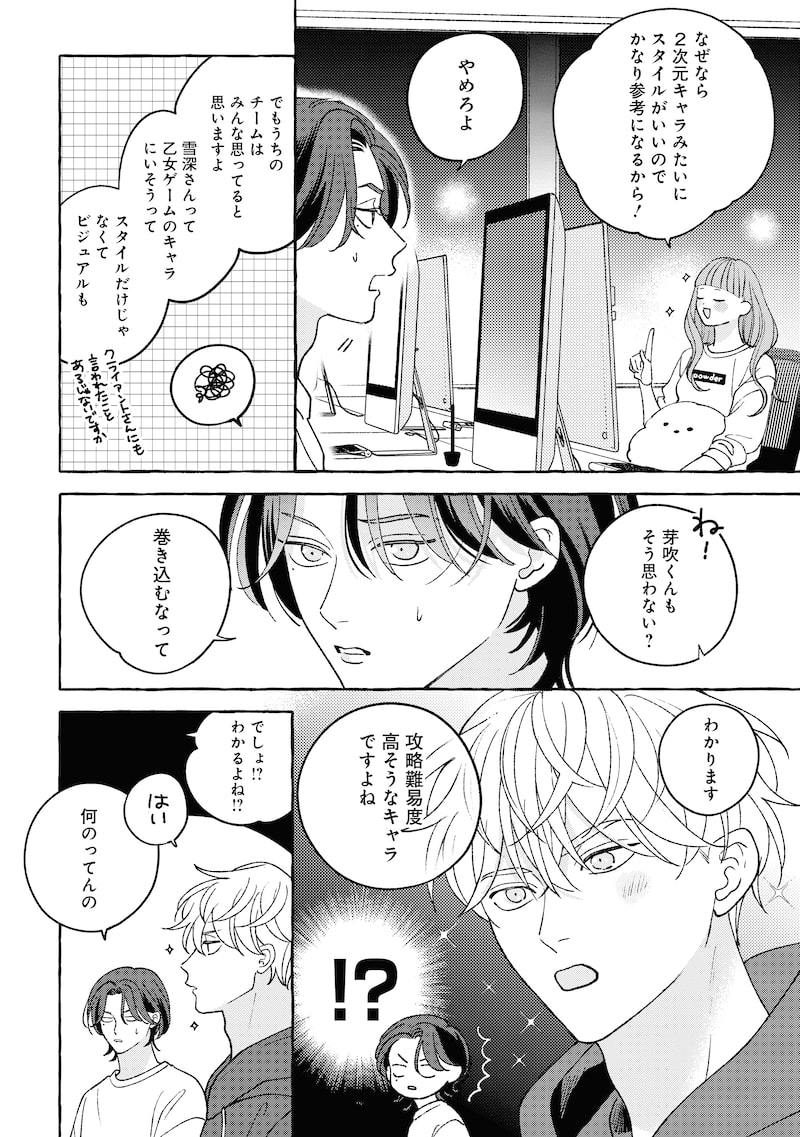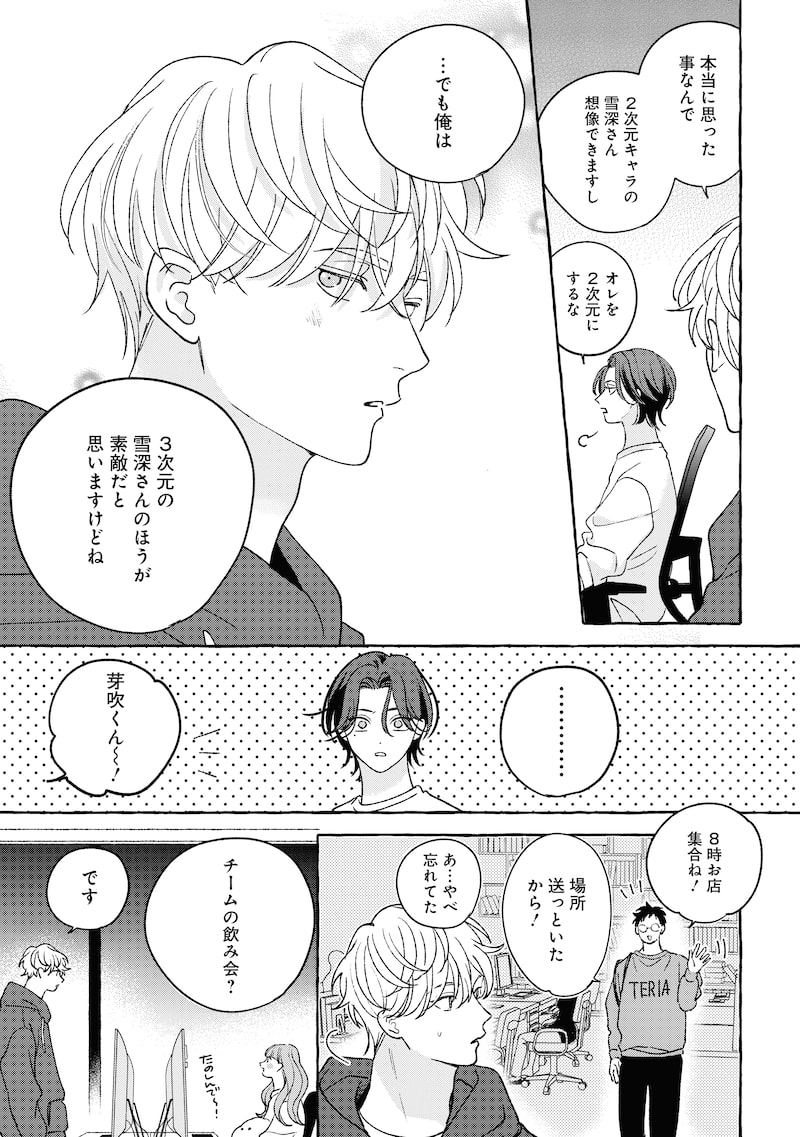 ゲーム制作会社でアートディレクターとして働く白浜雪深(しらはまゆきみ)。怪我により主要イラストレーターが休職してしまい、彼のチームに後輩の芽吹(めぶき)が助っ人として加わることになった。「雪深さんと一緒に仕事ができてうれしい」「2次元のキャラクターより3次元の雪深さんのほうが素敵」など、読めない表情でドキッとする言葉を口にしてくる芽吹。冗談だと思っていた雪深だが、どうやら芽吹は本気のようで……。