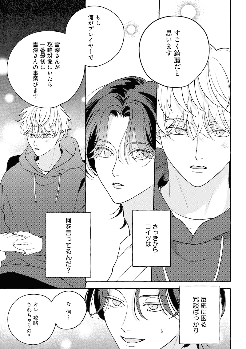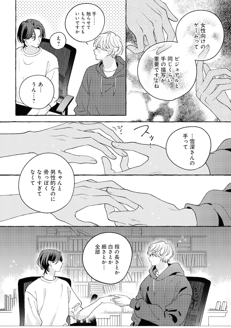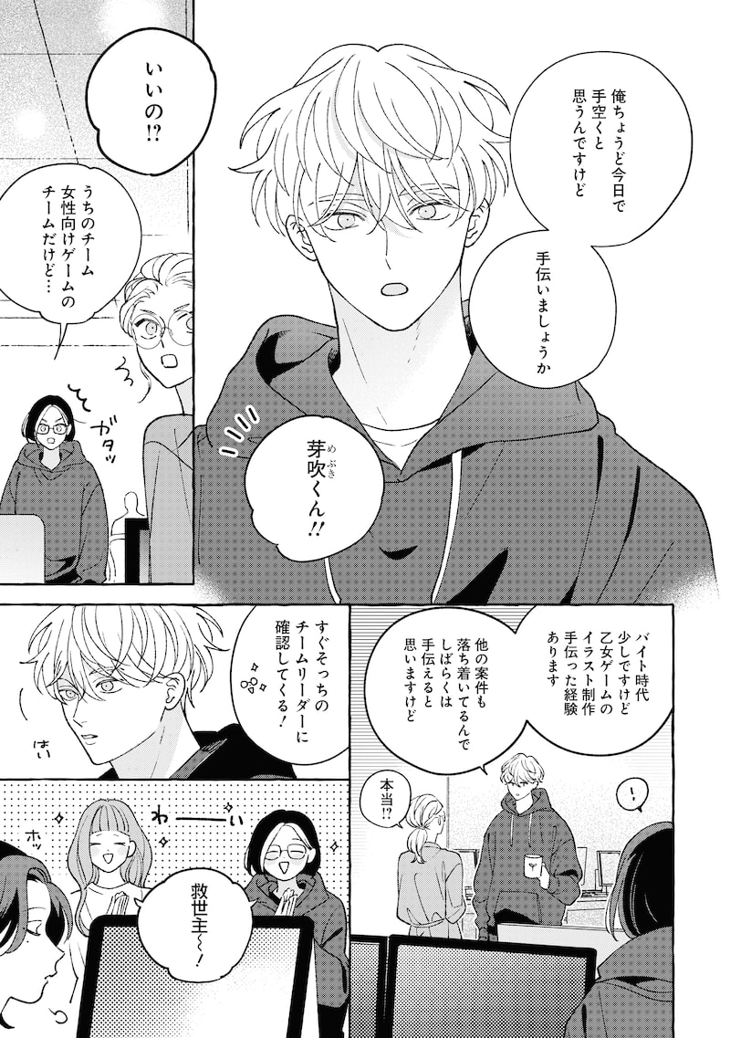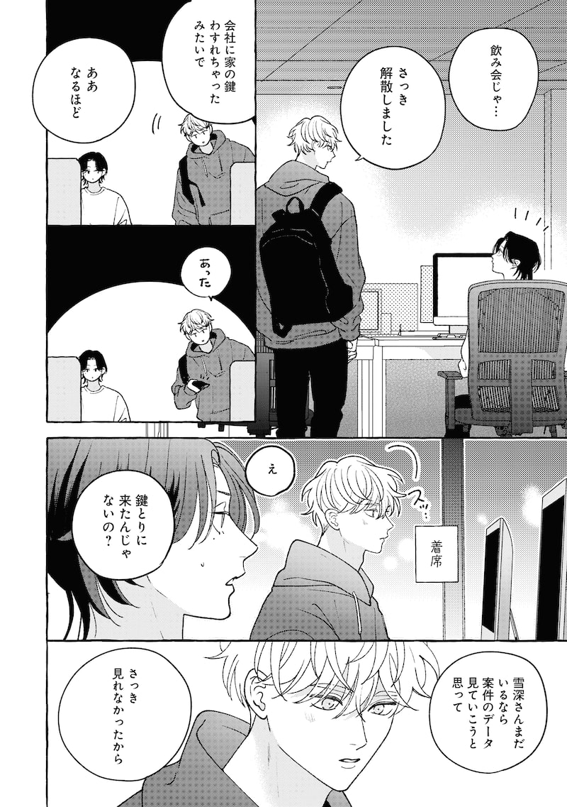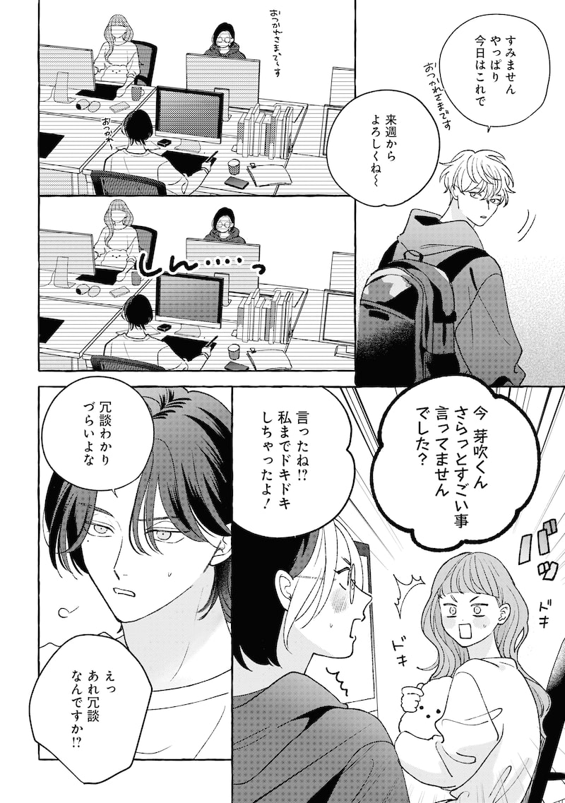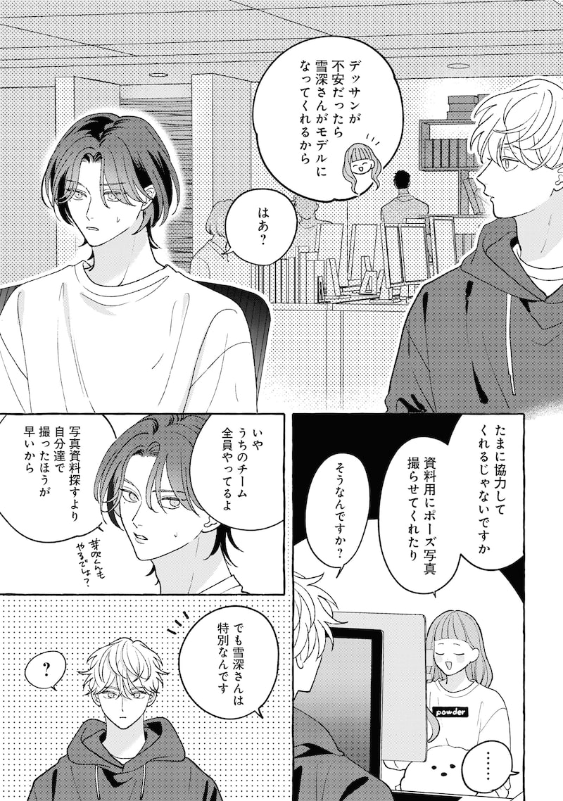 ゲーム制作会社でアートディレクターとして働く白浜雪深(しらはまゆきみ)。怪我により主要イラストレーターが休職してしまい、彼のチームに後輩の芽吹(めぶき)が助っ人として加わることになった。「雪深さんと一緒に仕事ができてうれしい」「2次元のキャラクターより3次元の雪深さんのほうが素敵」など、読めない表情でドキッとする言葉を口にしてくる芽吹。冗談だと思っていた雪深だが、どうやら芽吹は本気のようで……。