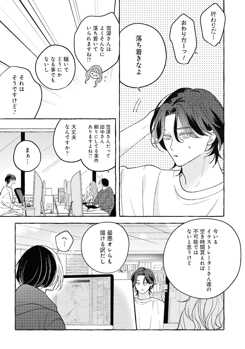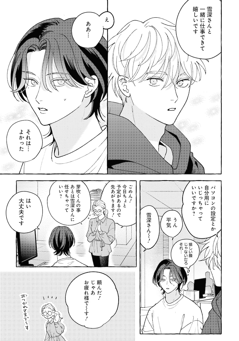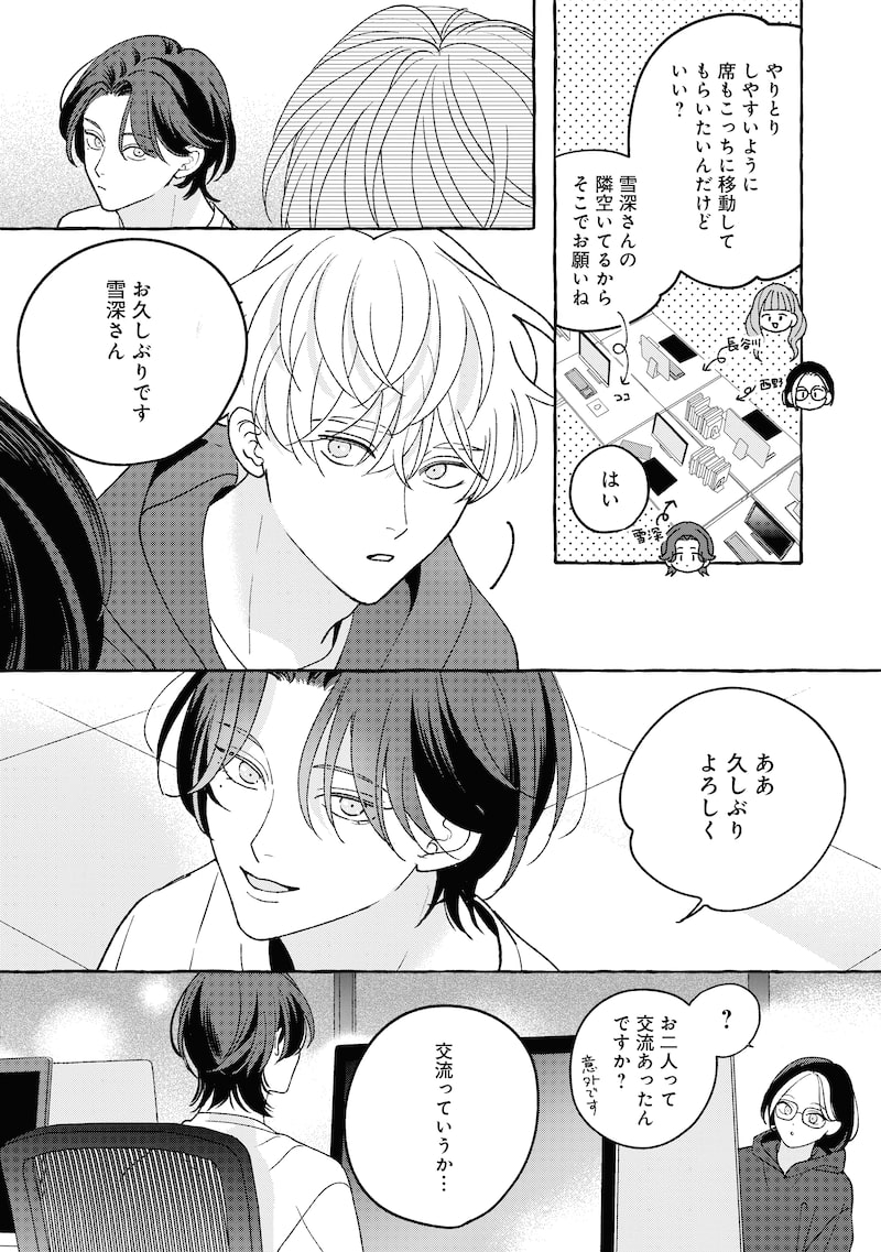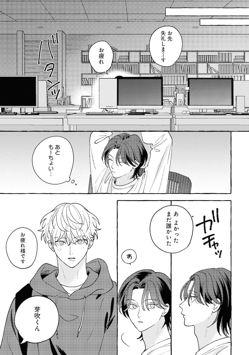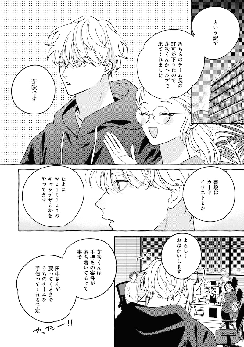 ゲーム制作会社でアートディレクターとして働く白浜雪深(しらはまゆきみ)。怪我により主要イラストレーターが休職してしまい、彼のチームに後輩の芽吹(めぶき)が助っ人として加わることになった。「雪深さんと一緒に仕事ができてうれしい」「2次元のキャラクターより3次元の雪深さんのほうが素敵」など、読めない表情でドキッとする言葉を口にしてくる芽吹。冗談だと思っていた雪深だが、どうやら芽吹は本気のようで……。