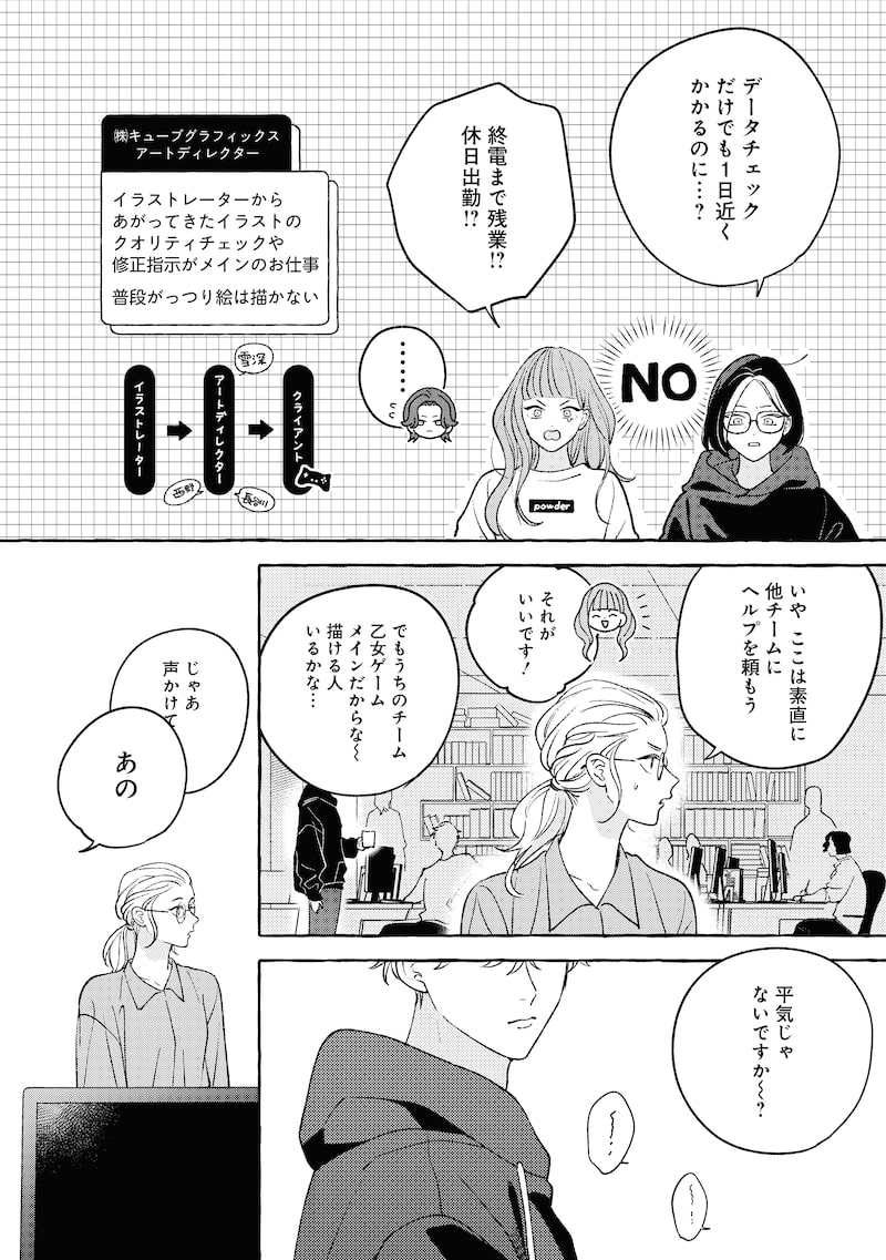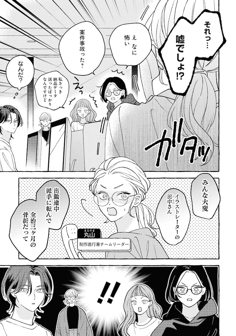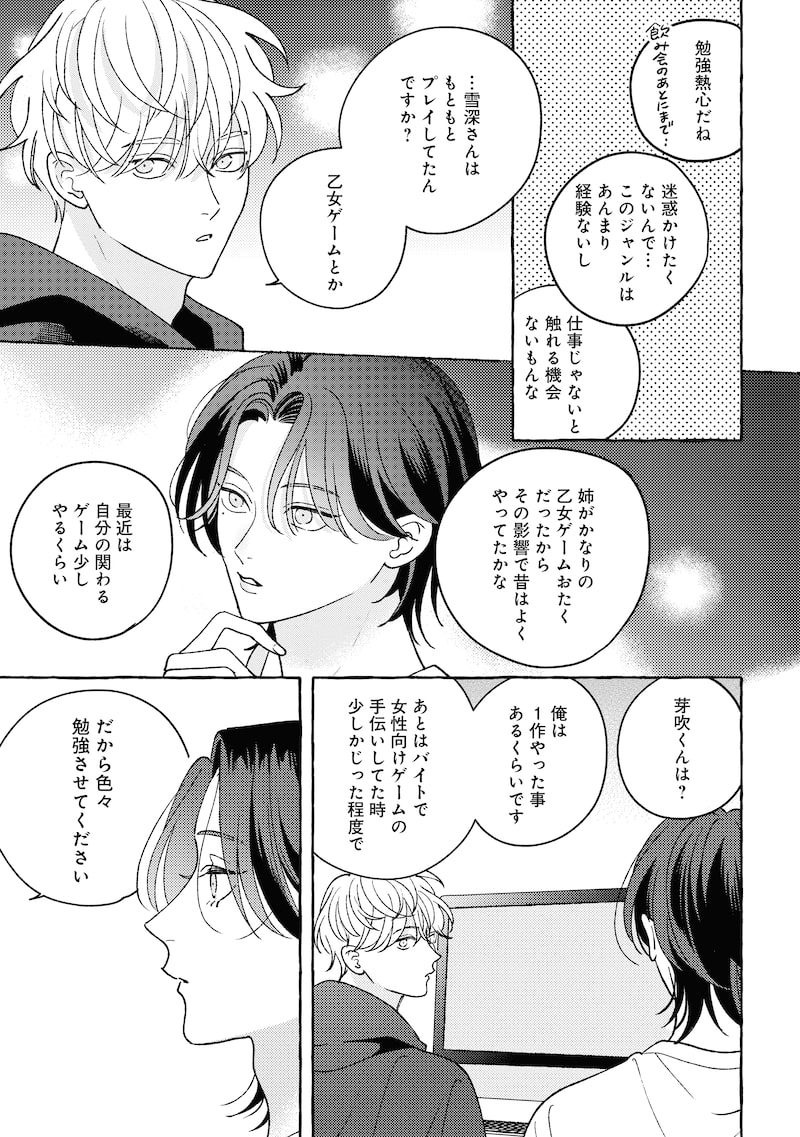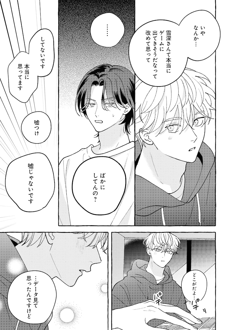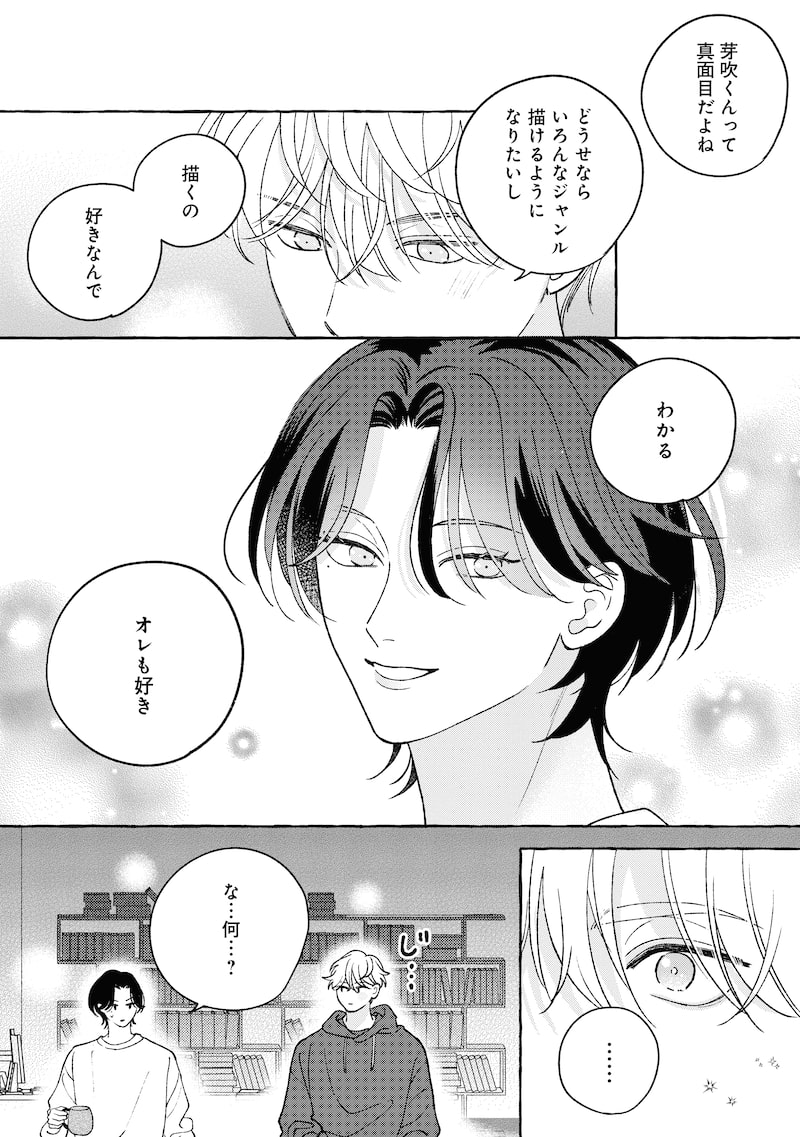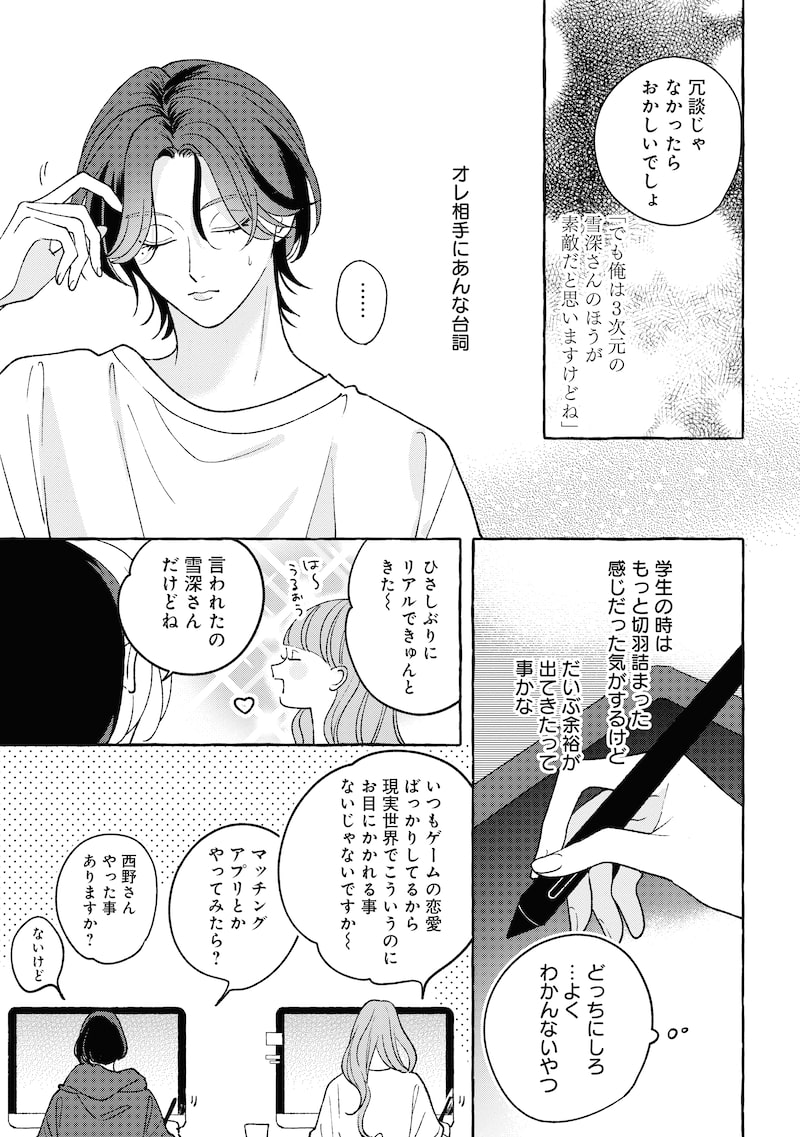 ゲーム制作会社でアートディレクターとして働く白浜雪深(しらはまゆきみ)。怪我により主要イラストレーターが休職してしまい、彼のチームに後輩の芽吹(めぶき)が助っ人として加わることになった。「雪深さんと一緒に仕事ができてうれしい」「2次元のキャラクターより3次元の雪深さんのほうが素敵」など、読めない表情でドキッとする言葉を口にしてくる芽吹。冗談だと思っていた雪深だが、どうやら芽吹は本気のようで……。
